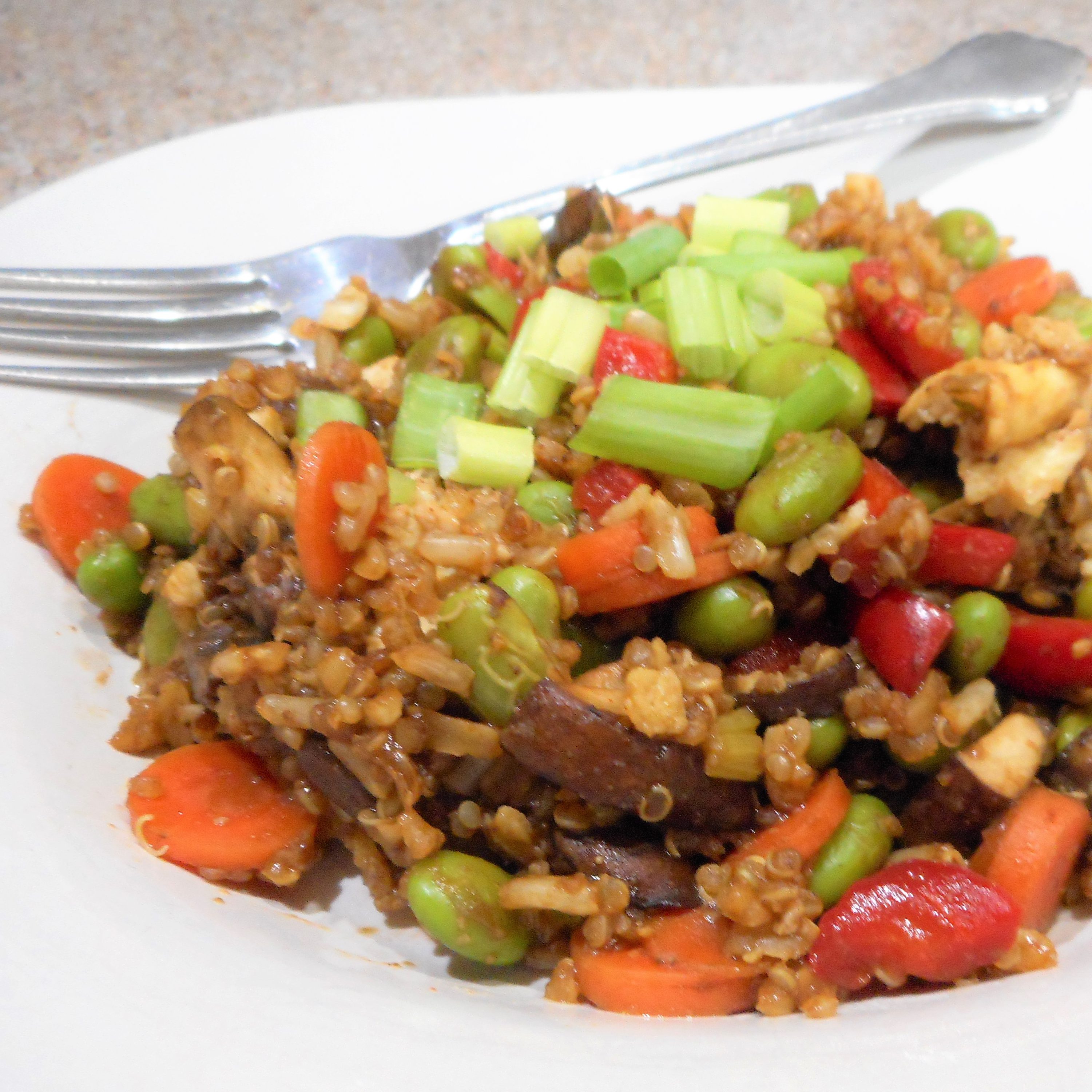 Meatless Monday was pretty simple too, a variation of Pork Fried Rice . Since it was supposed to be meatless, I left out the pork and added edamame, and for fun I used half brown rice and half quinoa. I just can’t persuade Michael to enjoy quinoa. The little squiggles in the grain seem to bother him. I don’t know if he’ll ever get over that either, but he eats it anyway. He knows I only serve two things on the menu – Take it or Leave it. Hunger wins every time.