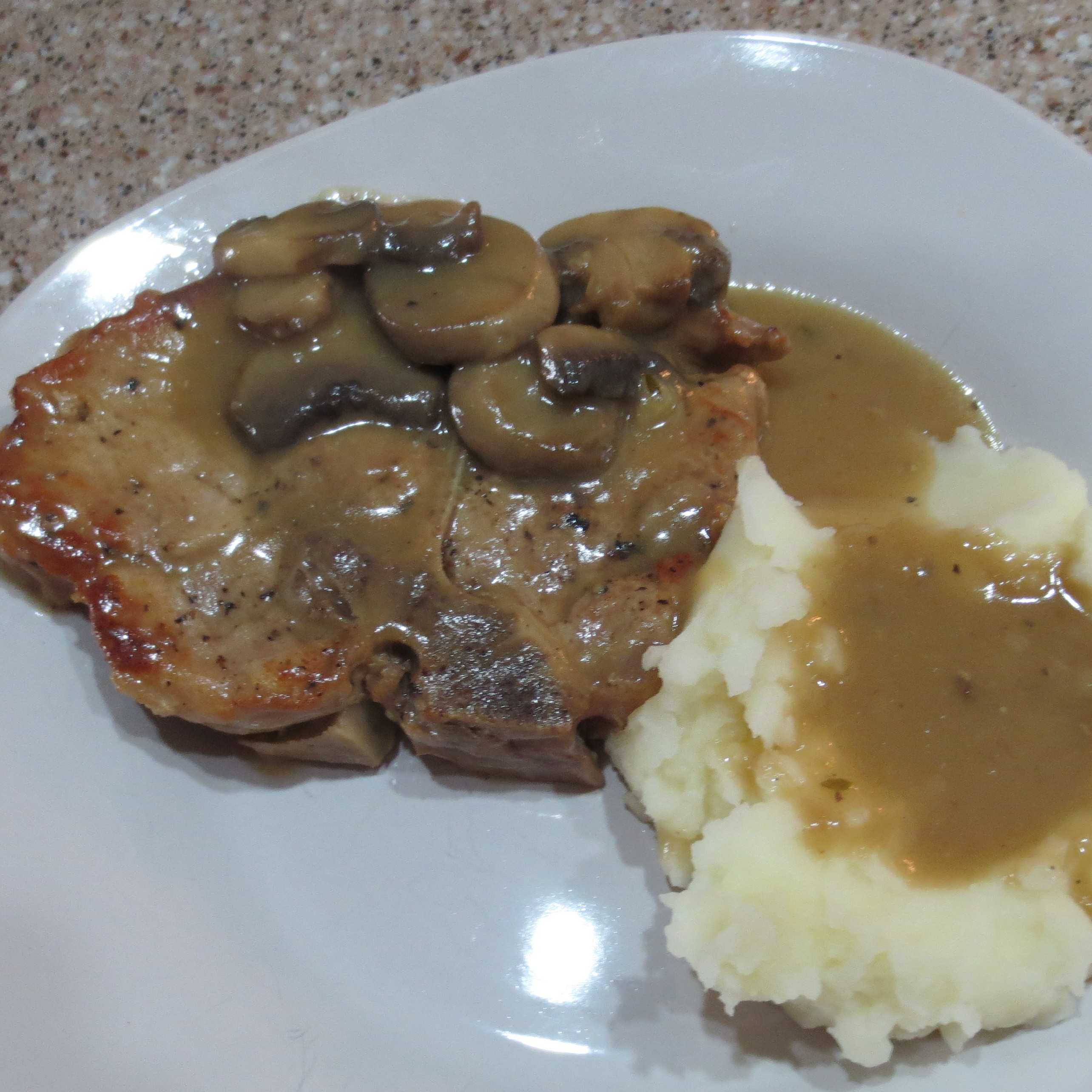This past Sunday’s pork roast was some kind of failure. I rubbed down a couple of pork tenderloins according to the recipe, but when I retrieved them at dinnertime the pork had turned a very unappetizing shade of “don’t cook me”. Although the package was within date and the pork didn’t have an off odor when I opened it, I chose to heed the warning, and the tenderloins went into the trash. Fortunately, pork chops cook quickly, even from the frozen state! Mashed potatoes are the mandatory side, just waiting for a green veggie to fill out the plate.