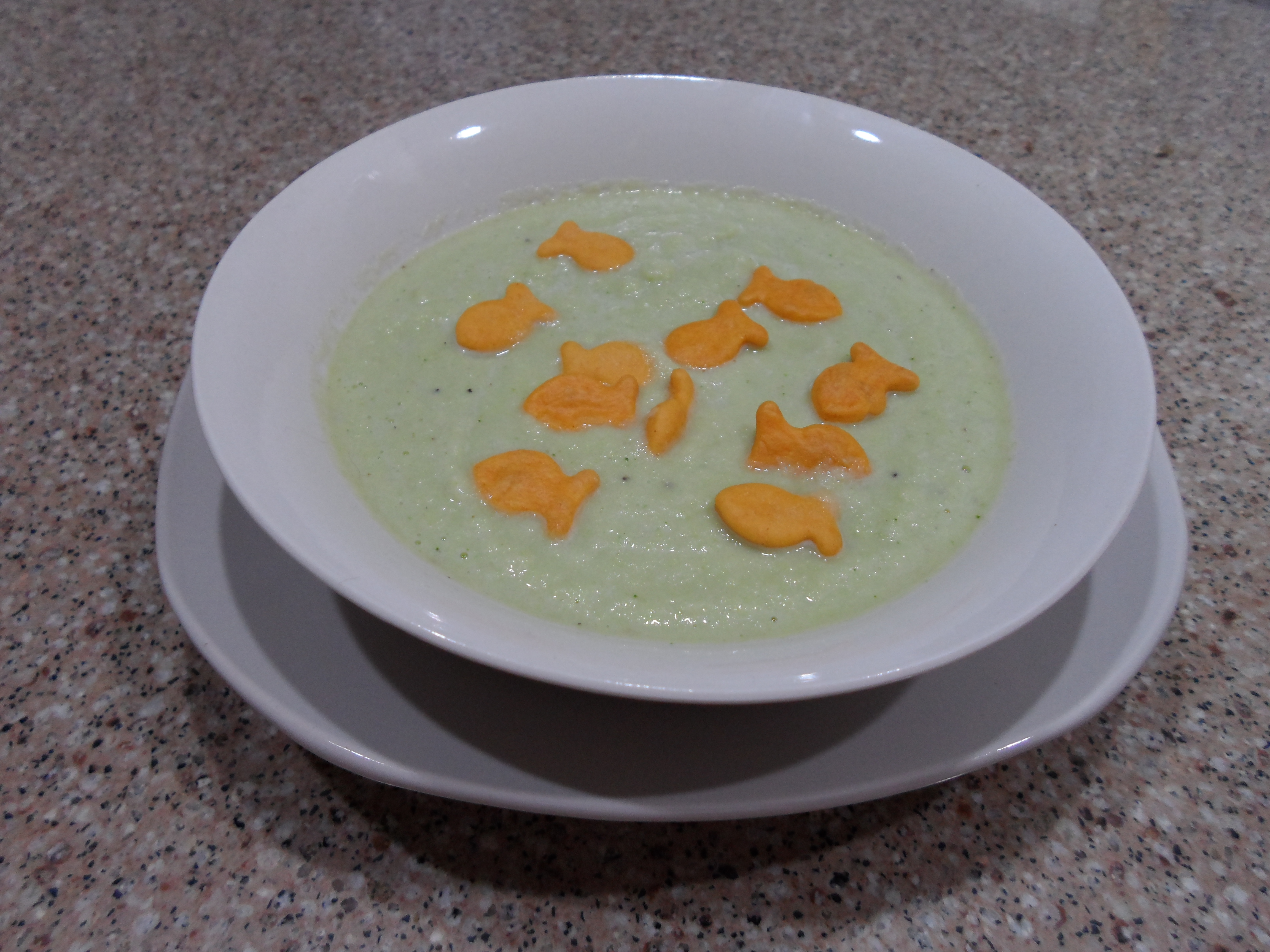 Meatless Monday Michael and I cleansed our palates with a nice pot of Free Broccoli Soup. This batch of soup wasn’t as free as the name indicates, as I started from scratch by purchasing the broccoli, but with the whole bunch of broccoli costing a whopping $2.50 who’s counting? I didn’t use all of the broccoli and there’s plenty of soup left for lunch later in the week, as well. That “free” soup goes a long way. Goldfish crackers make fun cheesy croutons if you keep those on hand, too.