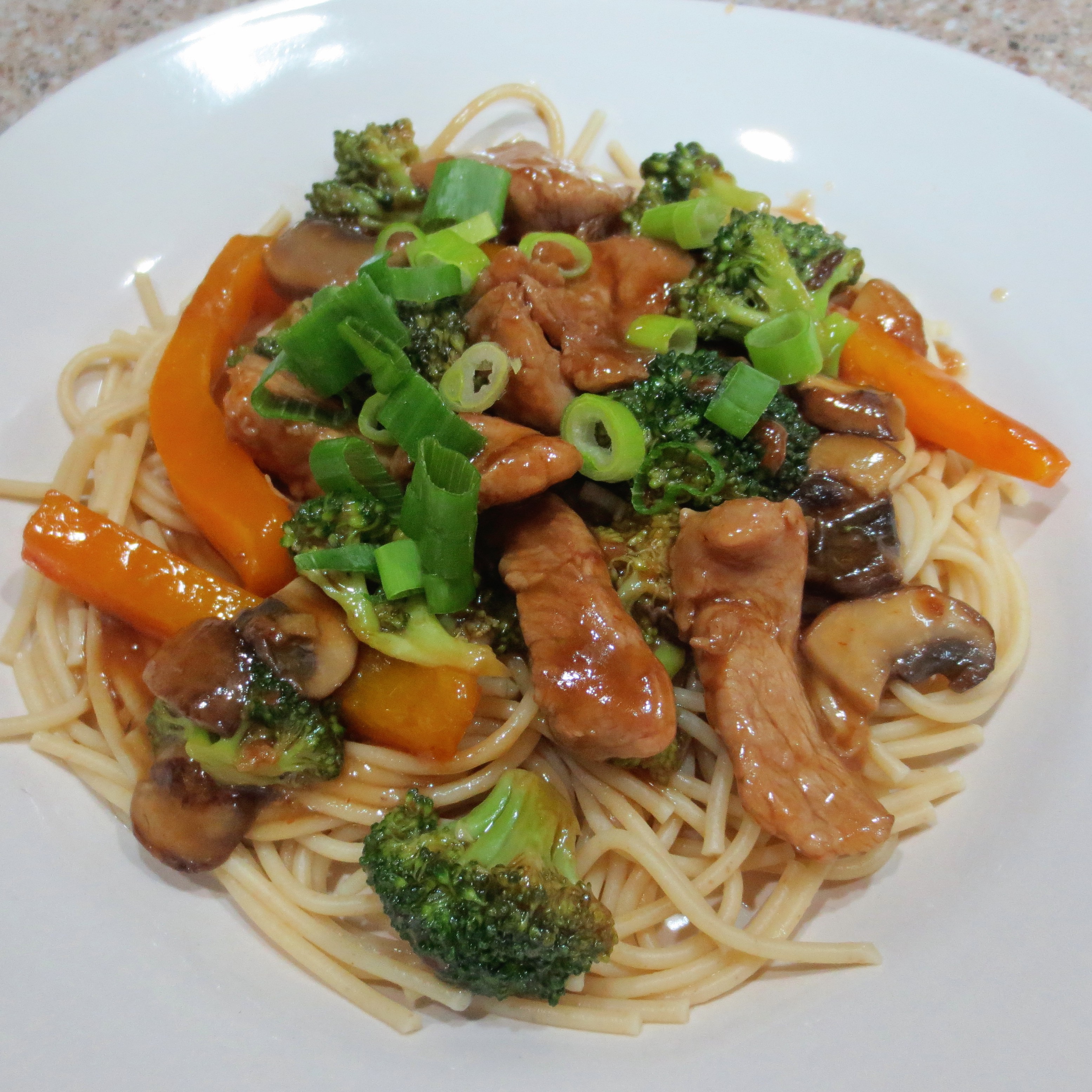 Tuesday night’s dinner was a spin on my Pork Stir-Fry with Sugar Snap Peas. I had some broccoli in the fridge and substituted that for the peas. Yellow bell peppers and sliced mushrooms went in too.