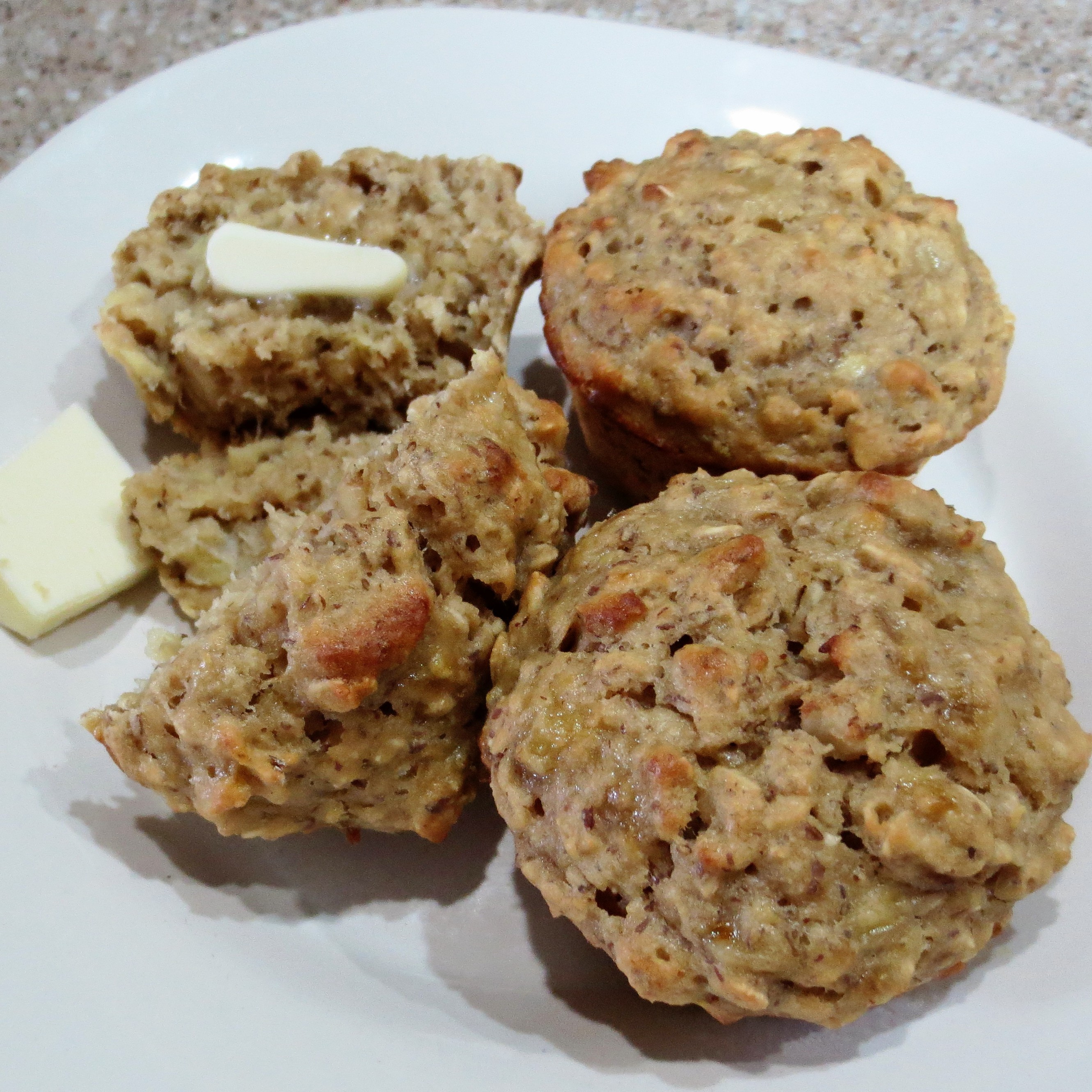 Something I do keep on hand for weekday breakfasts is a variety of muffins, frozen of course. We just wrap one in a paper towel and pop it in the microwave. Sometimes we add a smear of cream cheese or even peanut butter. Banana Oat Muffins are some of my best. Low cal(167 calories), low fat(2g), and high in fiber(3g), these are a good start. Without the optional nuts each muffin provides about 5g of protein. I usually have some Greek yogurt on the side.