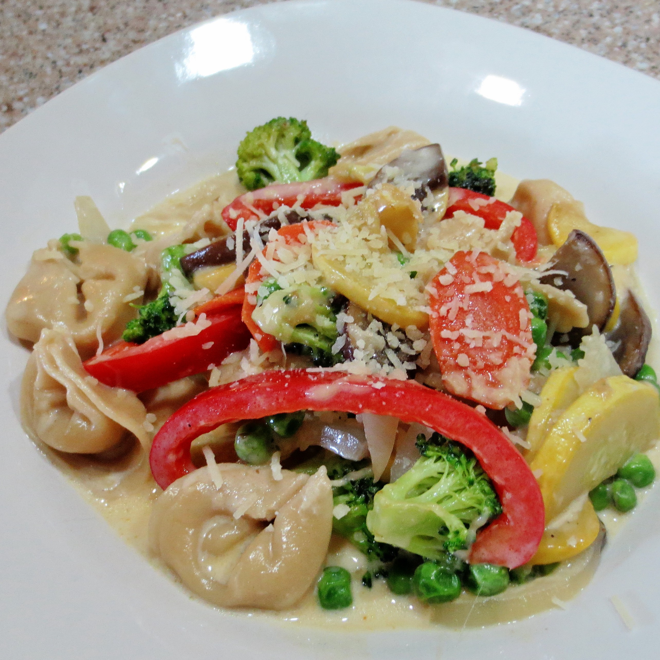 The next night I prepared another quick and healthy meatless meal. (Partly because I felt guilty about our previous Mexican meals out, but mostly because it fit the bill.) More veggies and some store-bought tortellini became Tortellini Primavera in no time.
