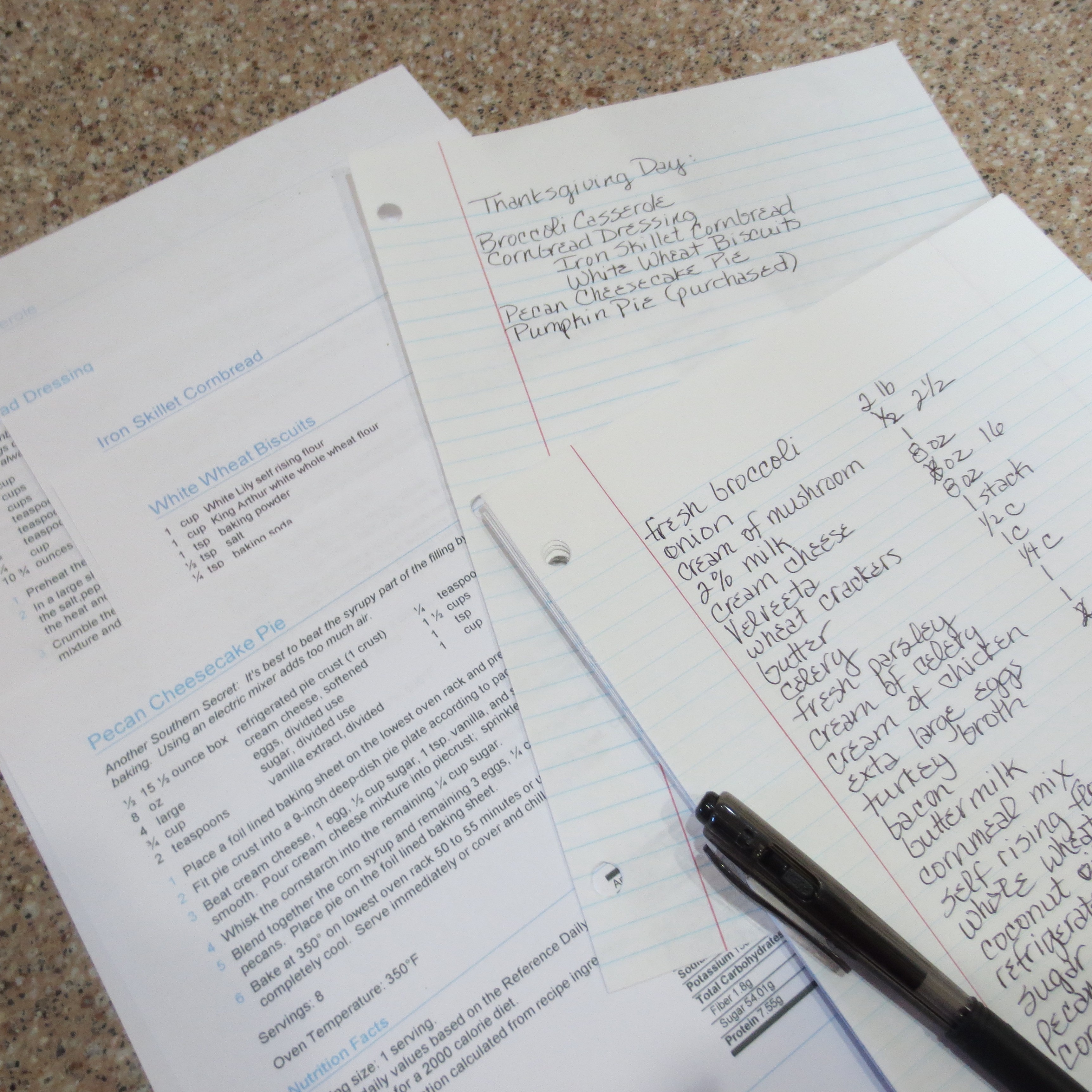 Next, it was time to prepare my shopping list. I sat down with the printed recipes and made a list of all the ingredients and the quantity needed, grouping the quantity of common items, like eggs for example. I found I would need a total of 10 eggs for all of the selected recipes. I compared the items on this master list with what I had on hand and came up with my shopping list. Since I had a general idea of what I might be cooking for Thanksgiving, many of these ingredients were purchased ahead, ideally as they came on sale. I added a pumpkin pie to the bottom of the list, since pumpkin pie is mandatory at Thanksgiving but I’m not good at baking them.