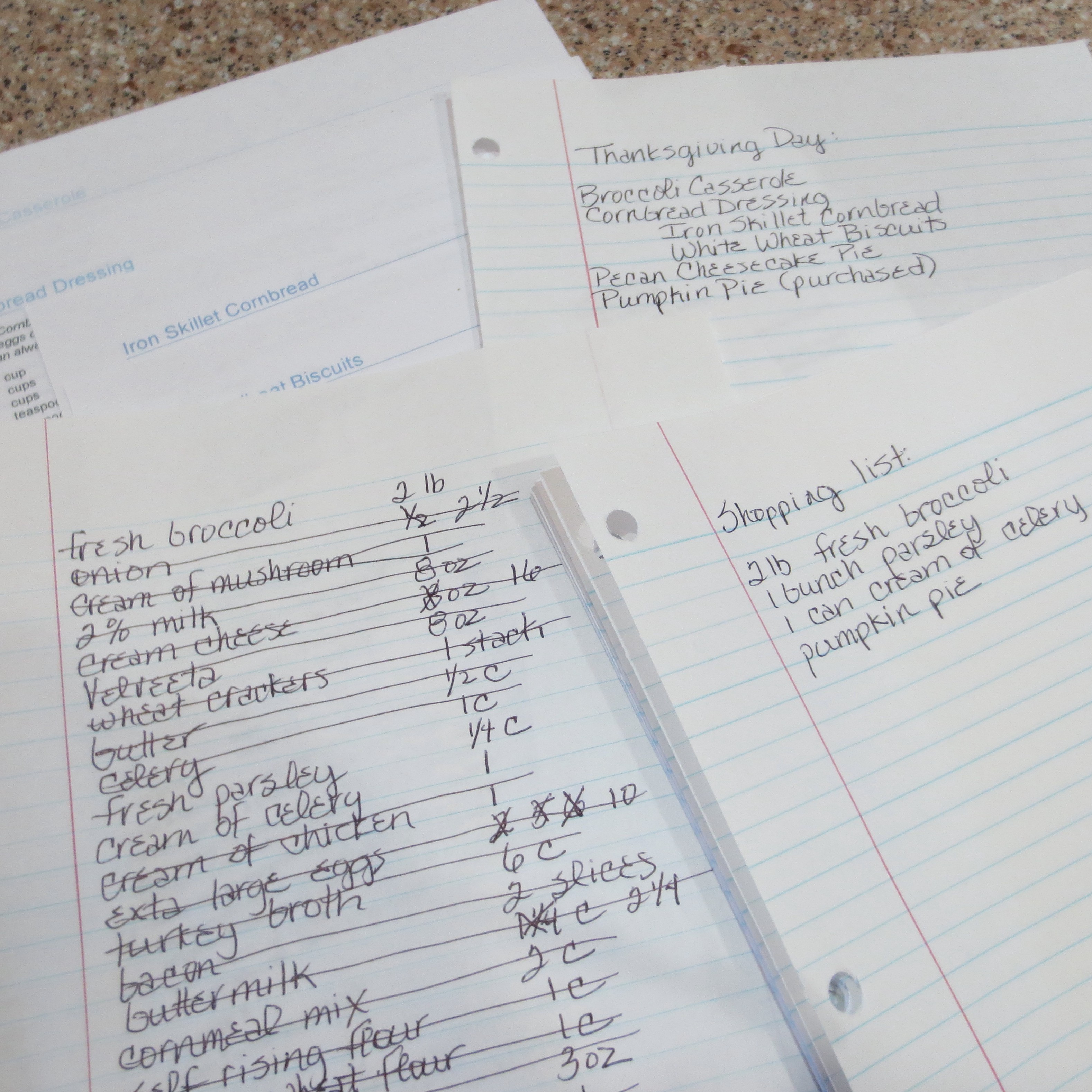 First, I go through my recipes to select a menu. Sometimes the menu is dictated by tradition, like Thanksgiving, and sometimes it’s more seasonal, like a summer barbecue. This year Emily is cooking the main meal at her house and we are bringing some of the sides and deserts. I pulled my recipes for Broccoli Casserole, Cornbread Dressing, Pecan Cheesecake Pie, and White Wheat Refrigerator Rolls. Reading the recipes, I noted that in order to make the dressing I would also need to bake a recipe of Iron Skillet Cornbread and some White Wheat Biscuits well in advance to let the breads go stale.