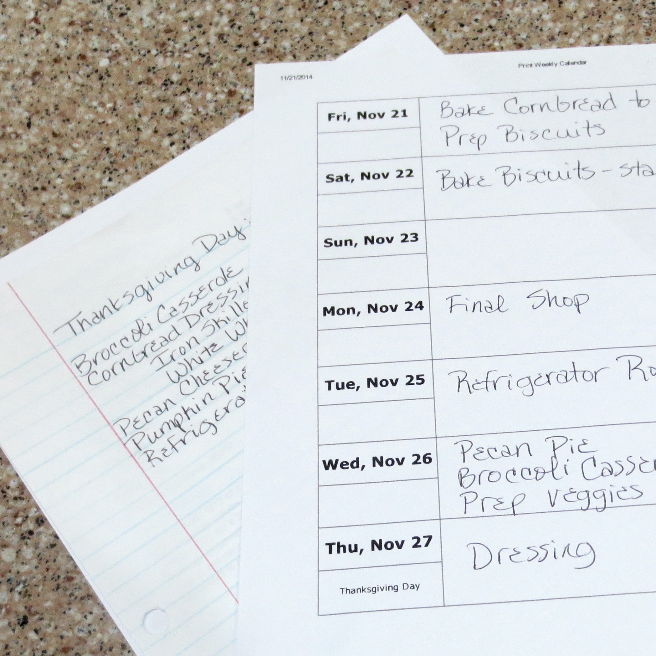 With my shopping list done I moved onto the next task, scheduling my time. Sometimes, scheduling time is both the hardest to plan as well as the hardest to execute. I try to build in a little blank time so my Sticky Menu Plan has room to slide. I try to have the bulk of my ingredients on hand well in advance, but with produce fresh is best, and that’s where it gets tricky. I do not like fighting the pre-holiday crowds at the grocery store. Monday is my compromise day for a final shop. Most of the produce is cooked into other dishes by Wednesday, so it’s not too far a stretch.