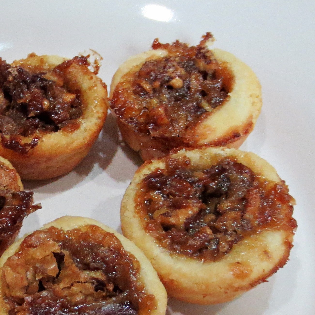 In all the whirl of activities, the camera was forgotten and I neglected to take pictures of anything on Saturday, but a few leftovers survived to pose for pictures the next day. My sweet offering, Pecan Tassies and just a few of Emily’s excellent Slow-Cooker Buffalo Chicken Meatballs were about all I had to work with.