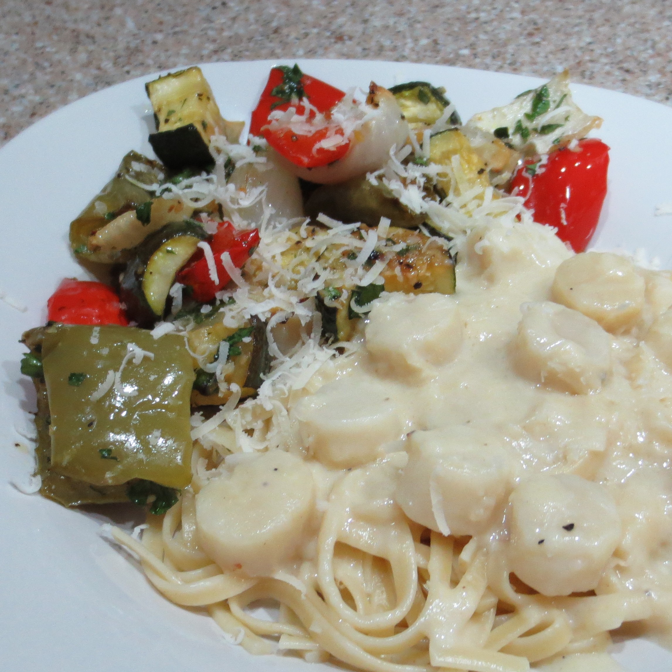 On Friday Bay Scallops in Garlic Cream Sauce sounded much more appealing than the menu’s Tuna Salad Salads, so that’s what we had. I had gone to the store for Saturday night’s dinner ingredients and the scallops were on sale. The tuna salad was not yet prepared, so why not?