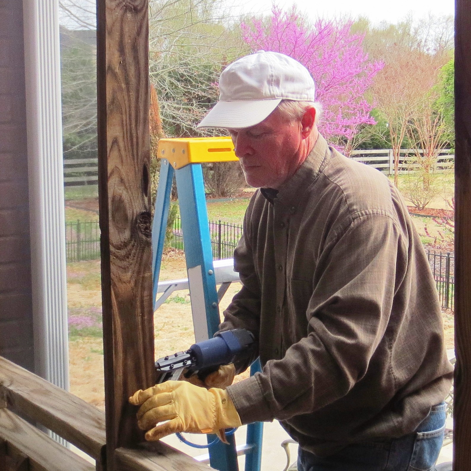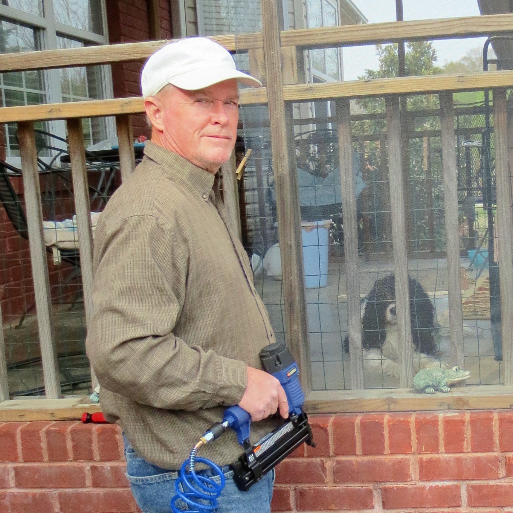 But first, a quick apology for this week’s post being late. I had a very important mission to fulfill, that of assistant to the construction crew that replaced the screening on our back porch. The lead contruction guy was my very handsome husband, who will be turning 65 this week, and the project supervisor was my dog, Lizzie. You can see her working from the inside of the porch, very fitting for a supervisor, don’t you think? My job was to hold things, hand things up the ladder, locate lost tools, and clean up debris. No time for any foolishness like the computer, but I was thrilled to have the screen replaced! They both did an excellent job.