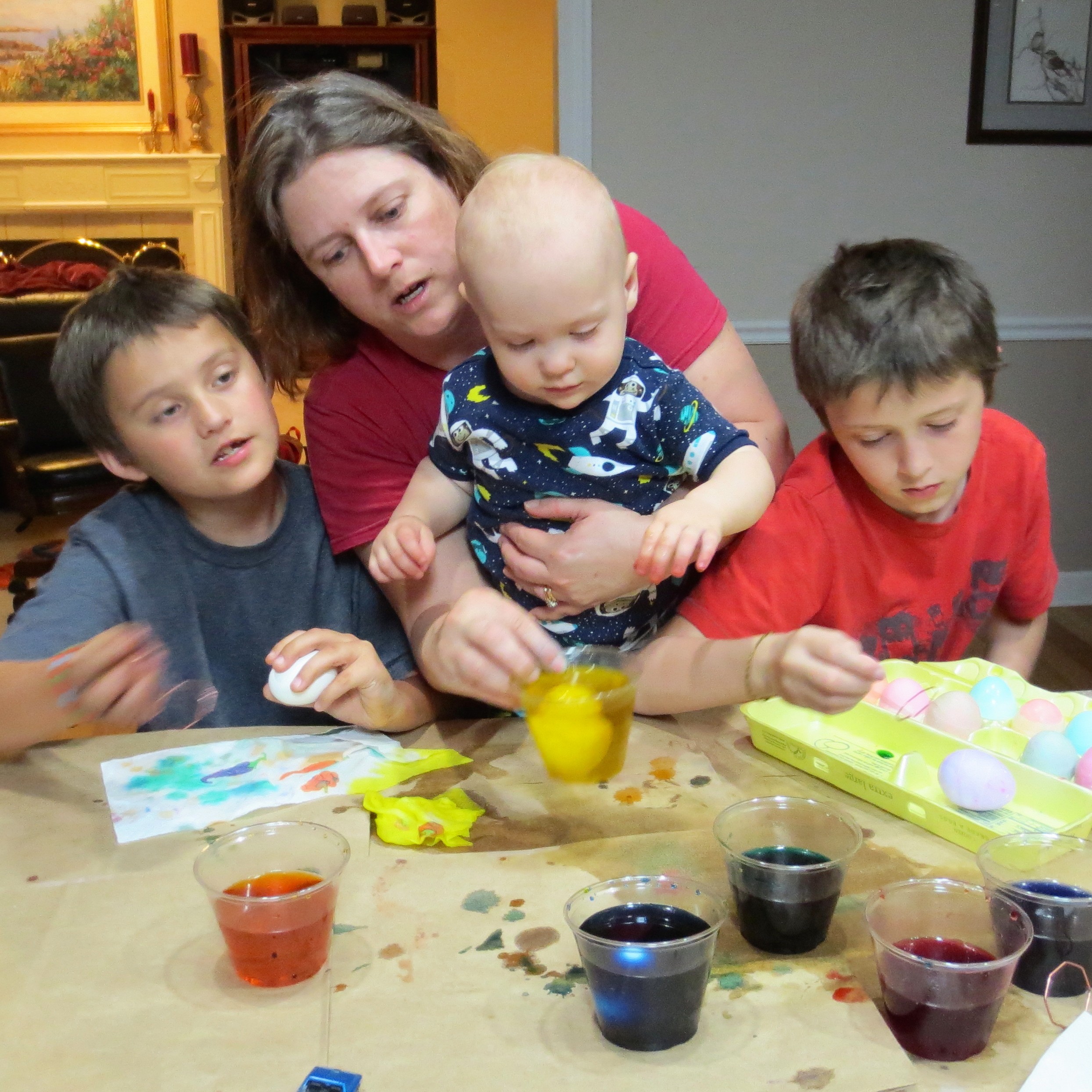 After dinner everyone got to the serious business of dying the Easter eggs. That’s Emily coming to Xander’s aid. Kaij made some really pretty designs and Kelton’s fingers were purple for days!