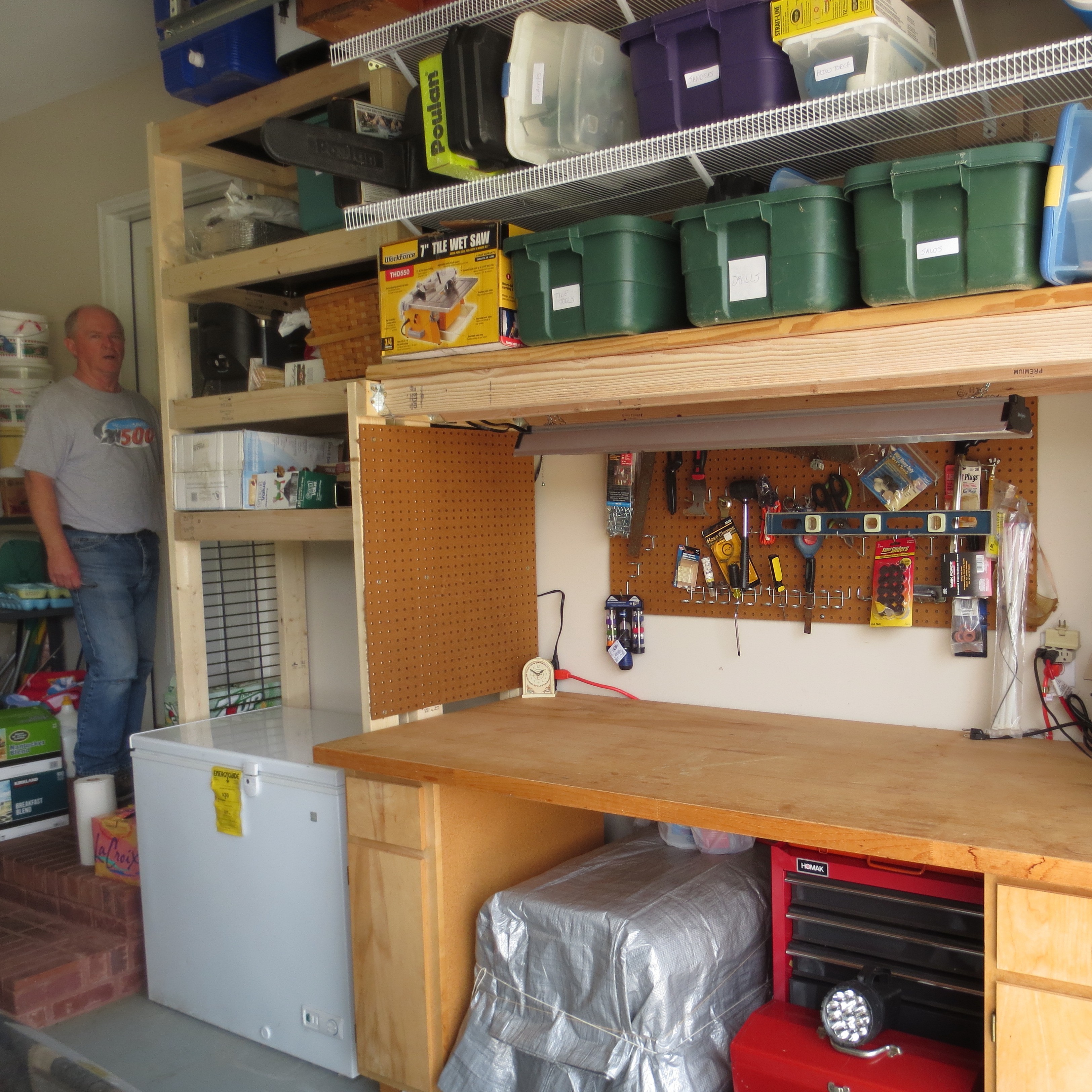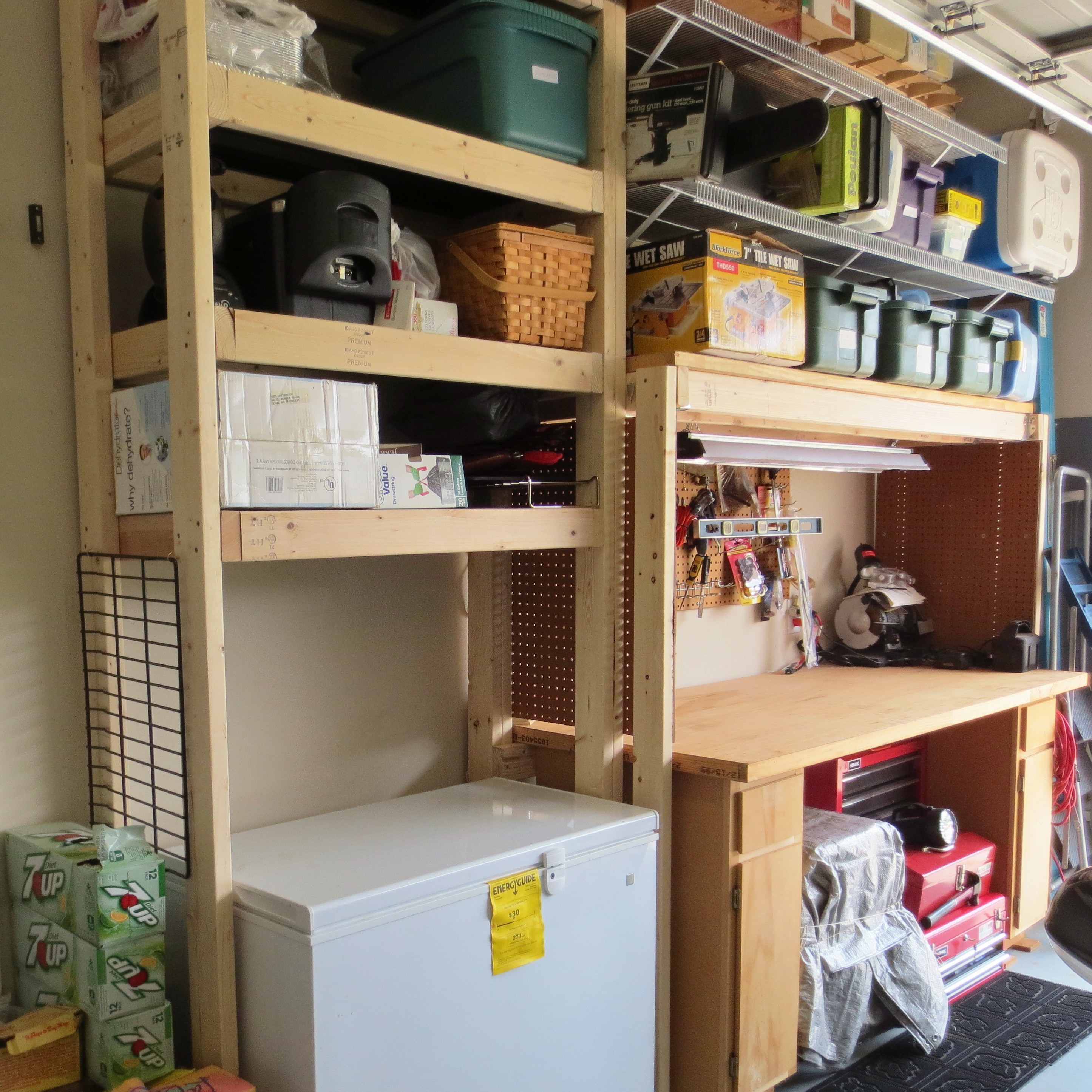 After a long winter of neglect, Michael decided it was time to clean out the garage. He has always held the dream of actually getting both the car and the truck into our two car garage. (Not going to happen!) He also got a nice new miter saw for his birthday, so that needed to be played with, right? Organization, plus a new tool equals a new project! We spent last week building phase one of the Great Garage Project.