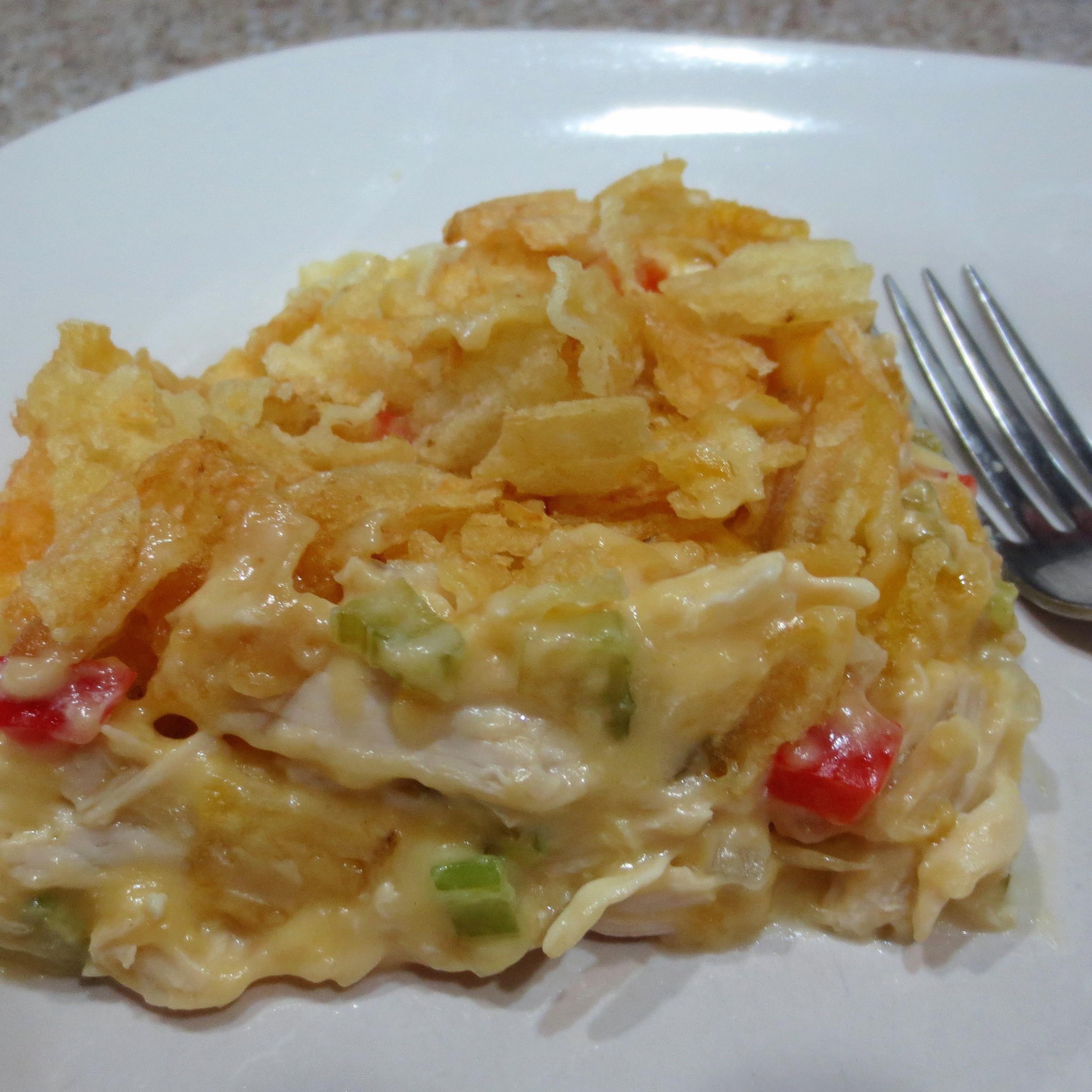 The chicken I purchased for Sunday was quite a bargain, so of course I had to buy extra. Wednesday we enjoyed Baked Chicken Salad with a sinfully delicious potato chip and cheese topping. The recipe makes 6 servings, so 2 extra casseroles, minus the topping, were stashed in the freezer for later.