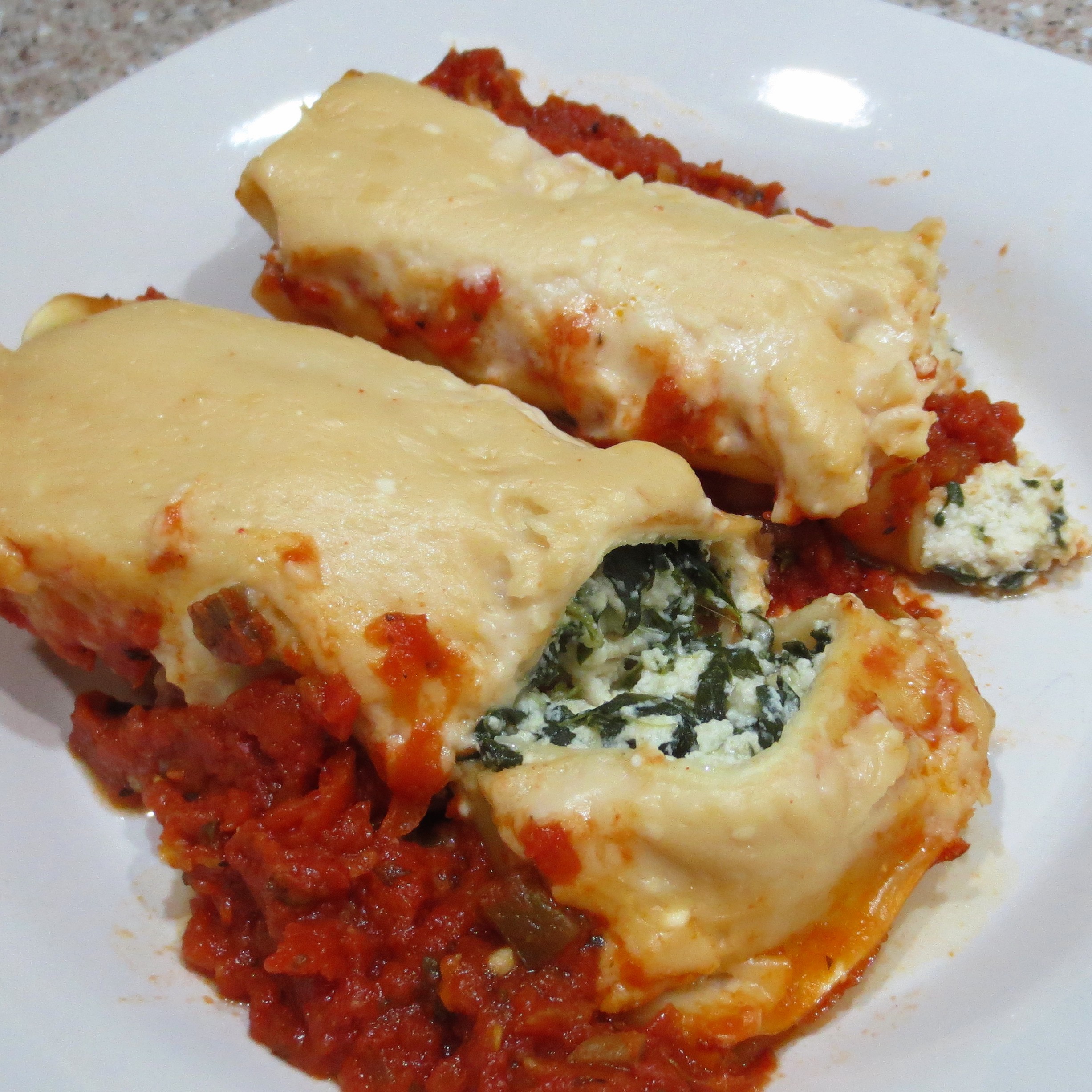 Since there was still plenty of chicken to work with, I played with my chicken manicotti recipe, trying to make it just a bit lighter and healthier, thus Chicken and Spinach Manicotti with Two Sauces II. I’ve decided many of my recipes could use a make-over, so whenever you see a recipe “II” that’s what it will indicate. I won’t delete the original recipe. That will remain unchanged, but version “II” may be a work in progress. It’s hard to create a healthy dish without sacrificing flavor, and I work at that a little at a time. This week’s effort produced an Alfredo that was a little too thick, but I may have just cooked it too long.