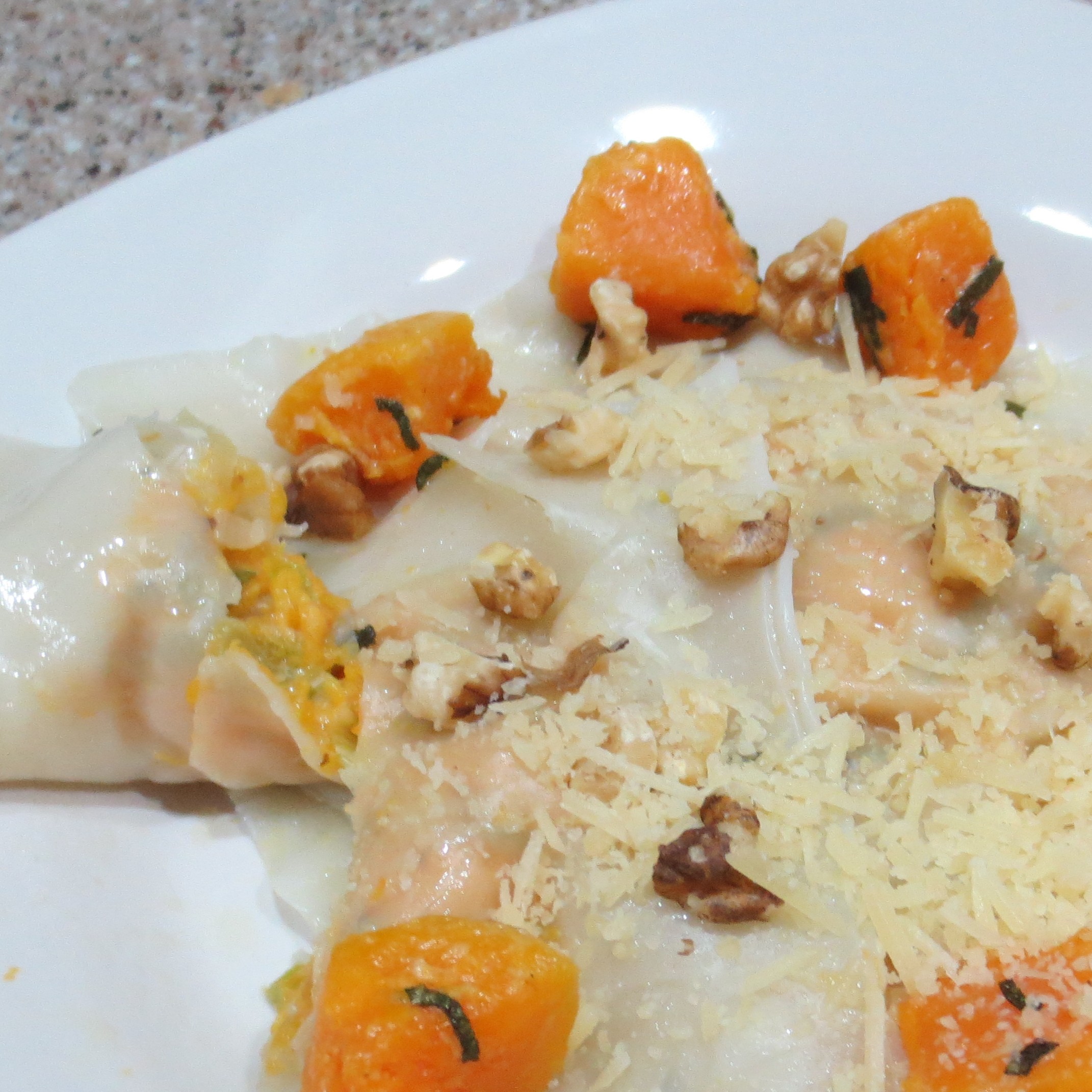 Monday brought a new concoction, Butternut Squash Ravioli to the dinner table. I liked it, but Michael was ambivalent. I think it was a little on the light side for him to consider a main dish. He thought Aaron would enjoy it though. (Don’t try to photograph ravioli in a light sauce on a white plate!)