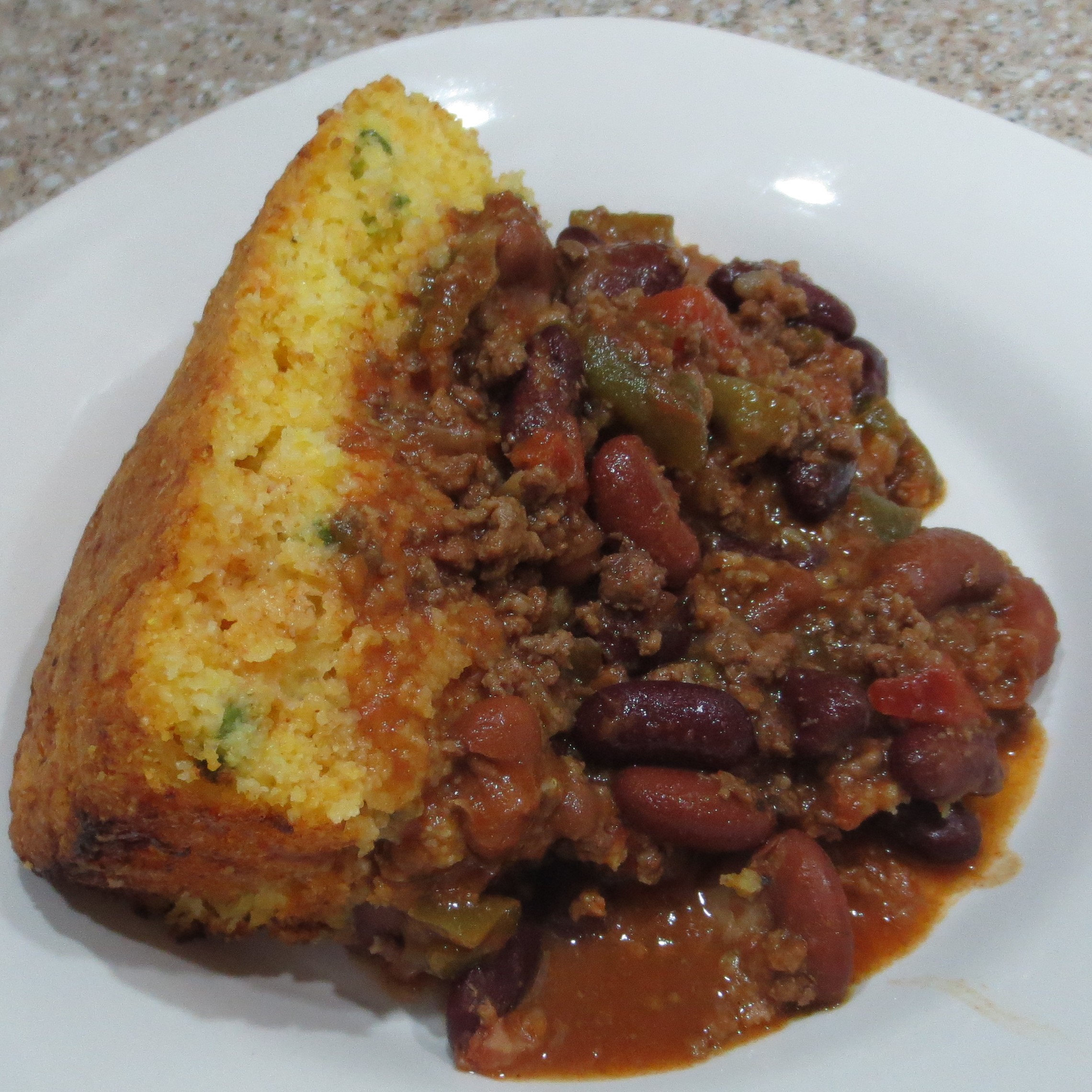 Wednesday I turned some Chili out of the freezer into Tamale Pie by topping the chili with half a recipe of Chili Cheese Corn Muffins . That’s really all there is to it. It makes a very filling meal, especially when preceeded by my house salad, and there was plenty to enjoy as leftovers the next day.