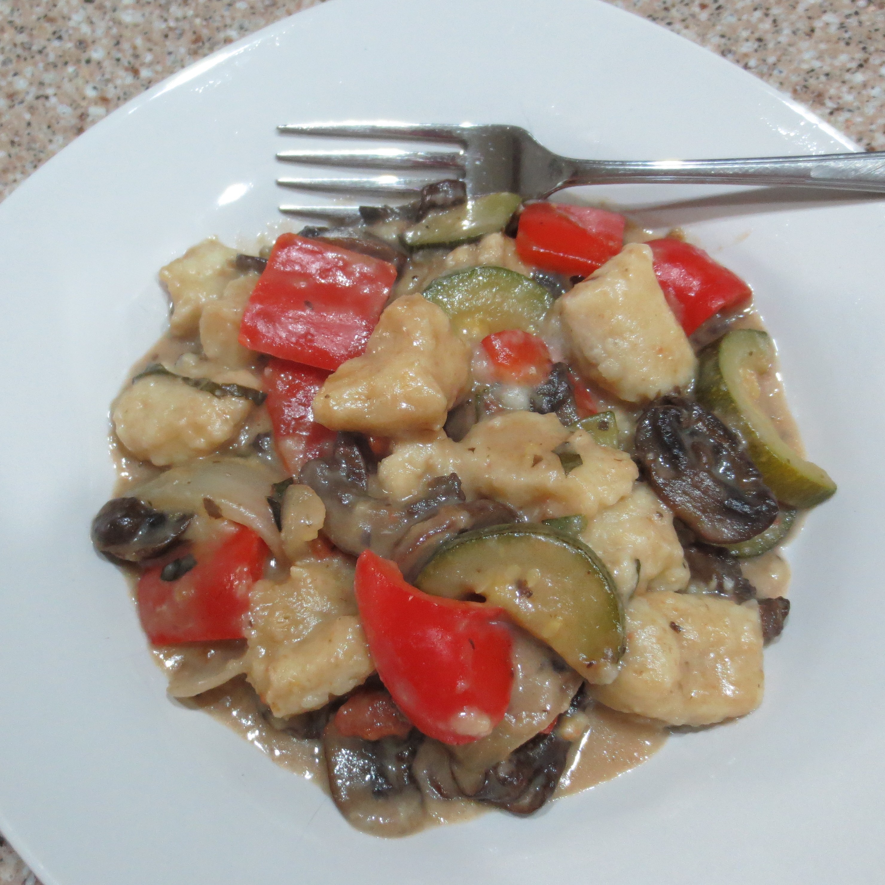 Meatless Monday I wanted to play some more with the Potato Gnocchi that I had frozen the week before. Lesson learned: believe the recipe when it instructs you to add the frozen gnocchi to the boiling water very few at a time or they will fall apart. I found it most effective to only add one at a time until there were several in the pot and fish each one out as it rose to the surface, then add another. This method didn’t really take any longer once I got started. The gnocchi were served in Summer Veggies with Gnocchi.