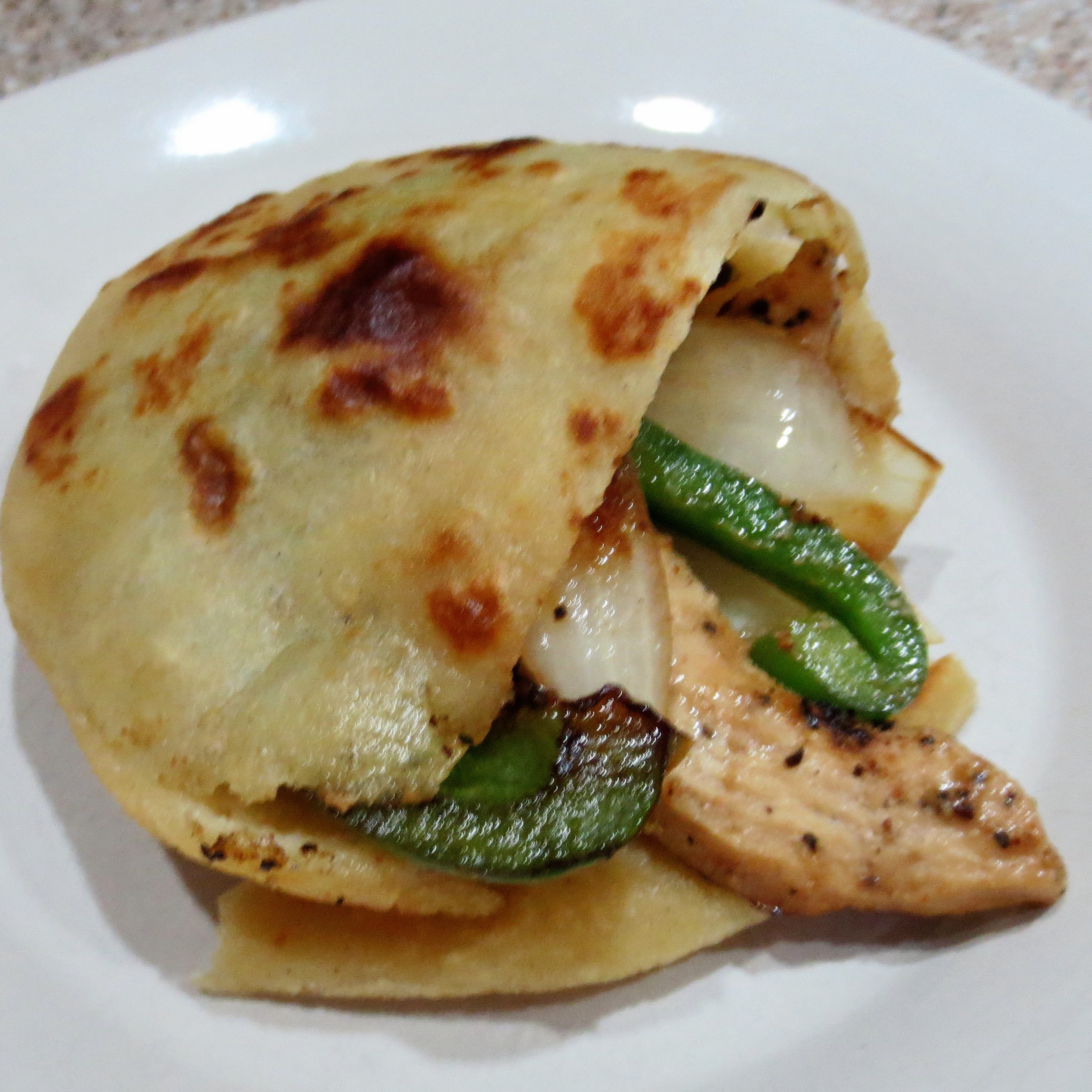 If you decide to make gorditas, you have to stuff them with something. Grilled Chicken Fajitas were my choice on Sunday. Normally, we grill those fajitas on a charcoal grill, but this Sunday it rained cats and dogs all day. Grilling outside was not an option. I pulled out my largest iron skillet instead and that worked just fine. I did add a little hickory smoke salt seasoning to the marinade in an effort to add some grilled flavor. Bottled liquid smoke seasoning would work too.