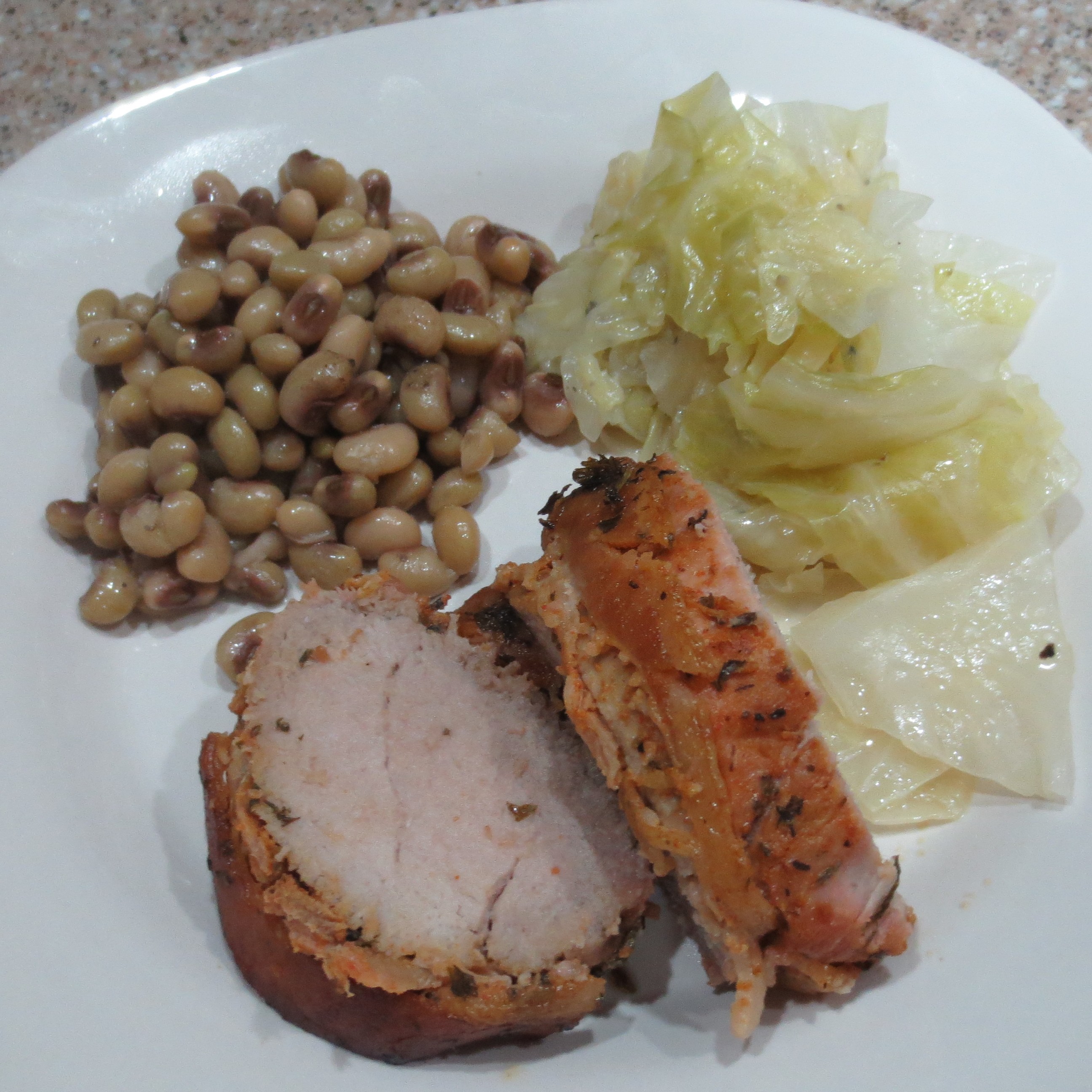 Our New Year’s Day dinner was the traditional, well, almost. In the South, that dinner follows a set menu. One must serve pork, because hogs always root forward, black eyed peas, for good luck, fortune, and money in coins, and greens, for more good fortune and folded money. Michael doesn’t care for traditional greens like collards, so I substitute cabbage. That’s green, right? Well, we’re still financially solvent, so I guess cabbage counts.