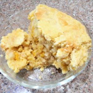 Sue Ellen’s Corn Pudding was just a little bit different take on the usual corn on the cob or cream style corn from the freezer.The kids seemed to like that one especially well, even though it was slightly over cooked. (I won’t tell if you don’t!) Corn pudding freezes well before it’s baked, so it’s a good dish for two if you’d like to make up a batch and freeze some just to have a different veggie on hand. It doesn’t reheat well after baking, though, as it tends to dry out, so bake just what you need.