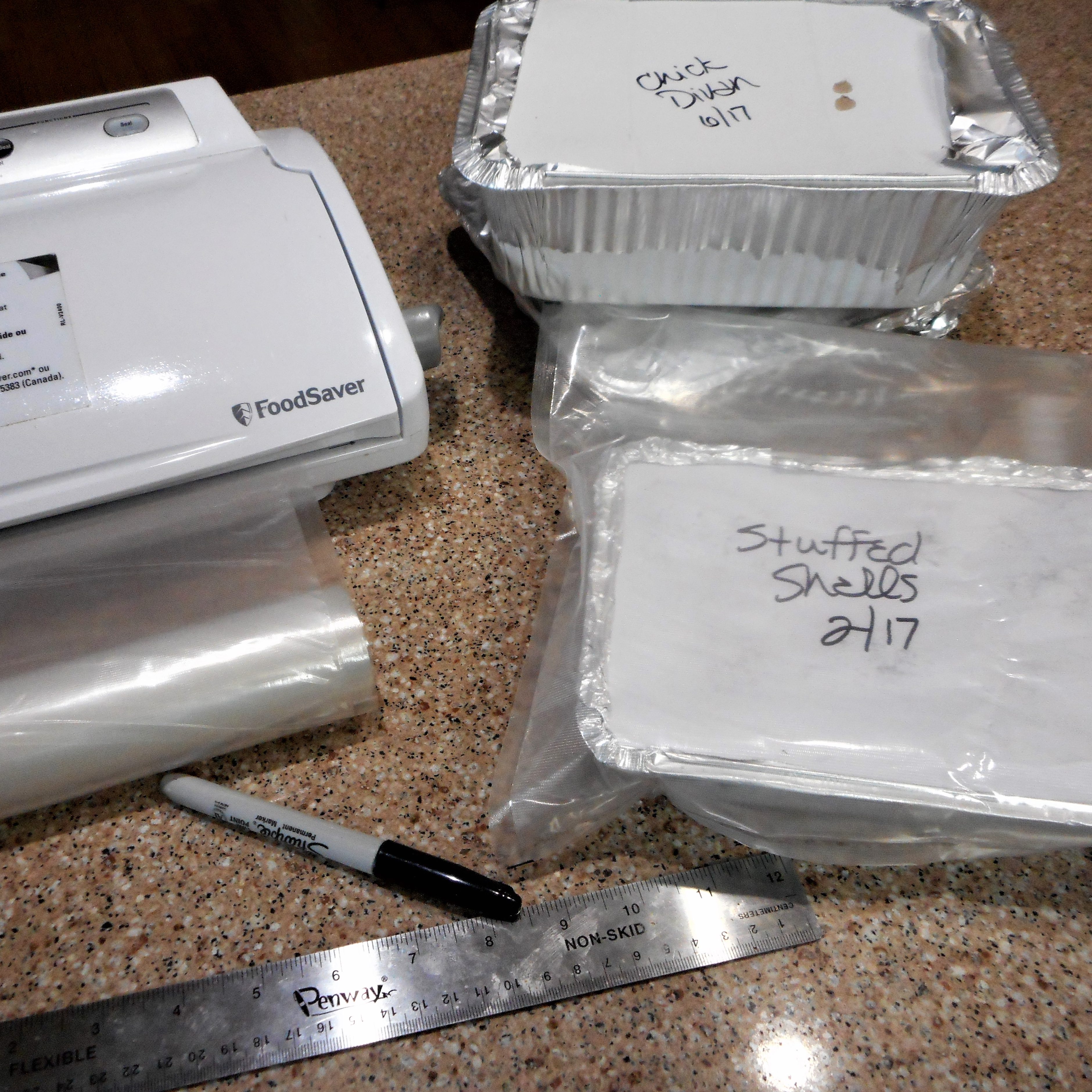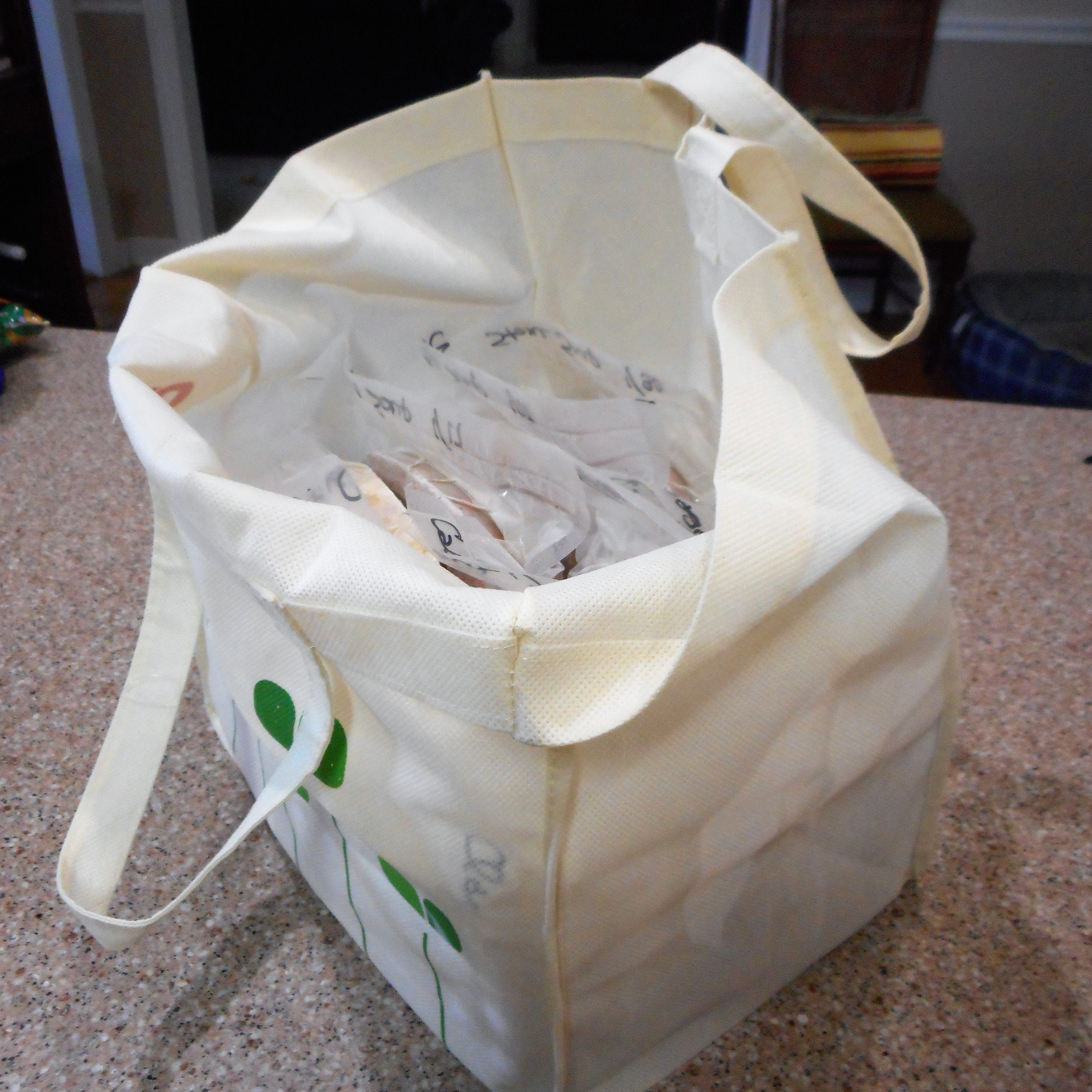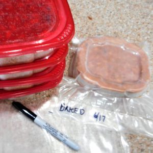 Soups and side dishes, like Slow-Cooked Baked Beans, that I intend to heat stove top, are often frozen in recycled plastic containers like those that lunch meat come in. Again, they benefit from air-tight packaging after the contents are frozen. Having many of my sides frozen in identically shaped packaging makes them stack efficiently in the freezer, but I have one more trick up my sleeve. I corral like packages in reusable grocery bags to keep them organized and easy to retrieve from my chest freezer.
