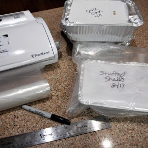 All this work hasn’t left much time for day-to-day cooking, but we’ve managed.  We took the day off last Sunday, just to relax.  New York Speidies took no time to grill, and since they came from my freezer stash they took no time to prepare.  While I was poking around in the freezers I came up with some Cauliflower Baked Shells and Cheese.  I had frozen our two portions in a foil container, so all I had to do was pop it in the toaster oven. With the combination of pasta and cauliflower, this was the perfect side for that night’s dinner.