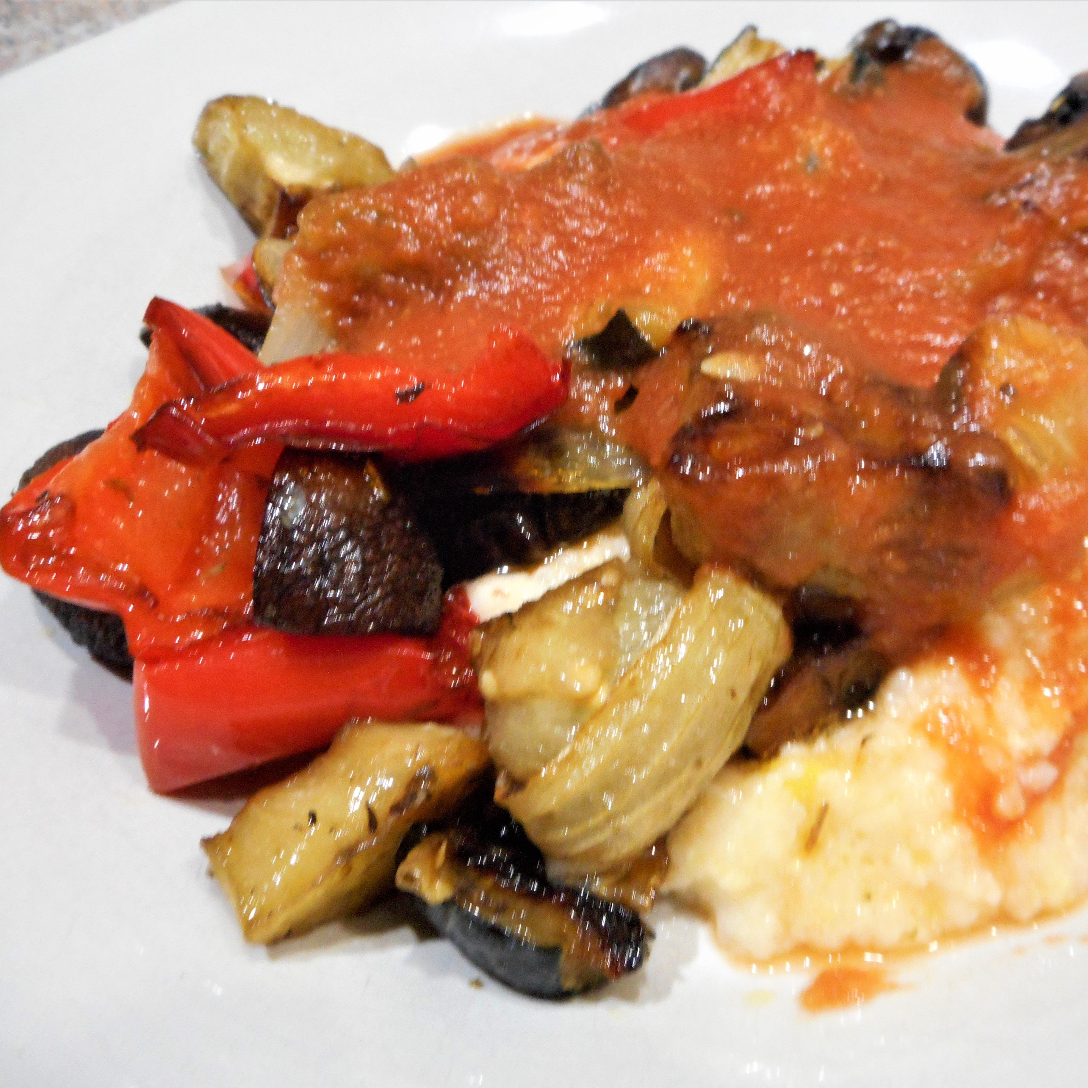 For Meatless Monday another round of my Roasted Vegetable Medley went straight from the garden to a sheet pan in the oven. The eggplant was so fresh I didn’t even bother with the pre-salting and rinsing business. There was none of the bitterness that eggplants tend to develop in storage.  More Homemade Marinara Sauce and some Cheese Grits also came out of the freezer to complete the meal.