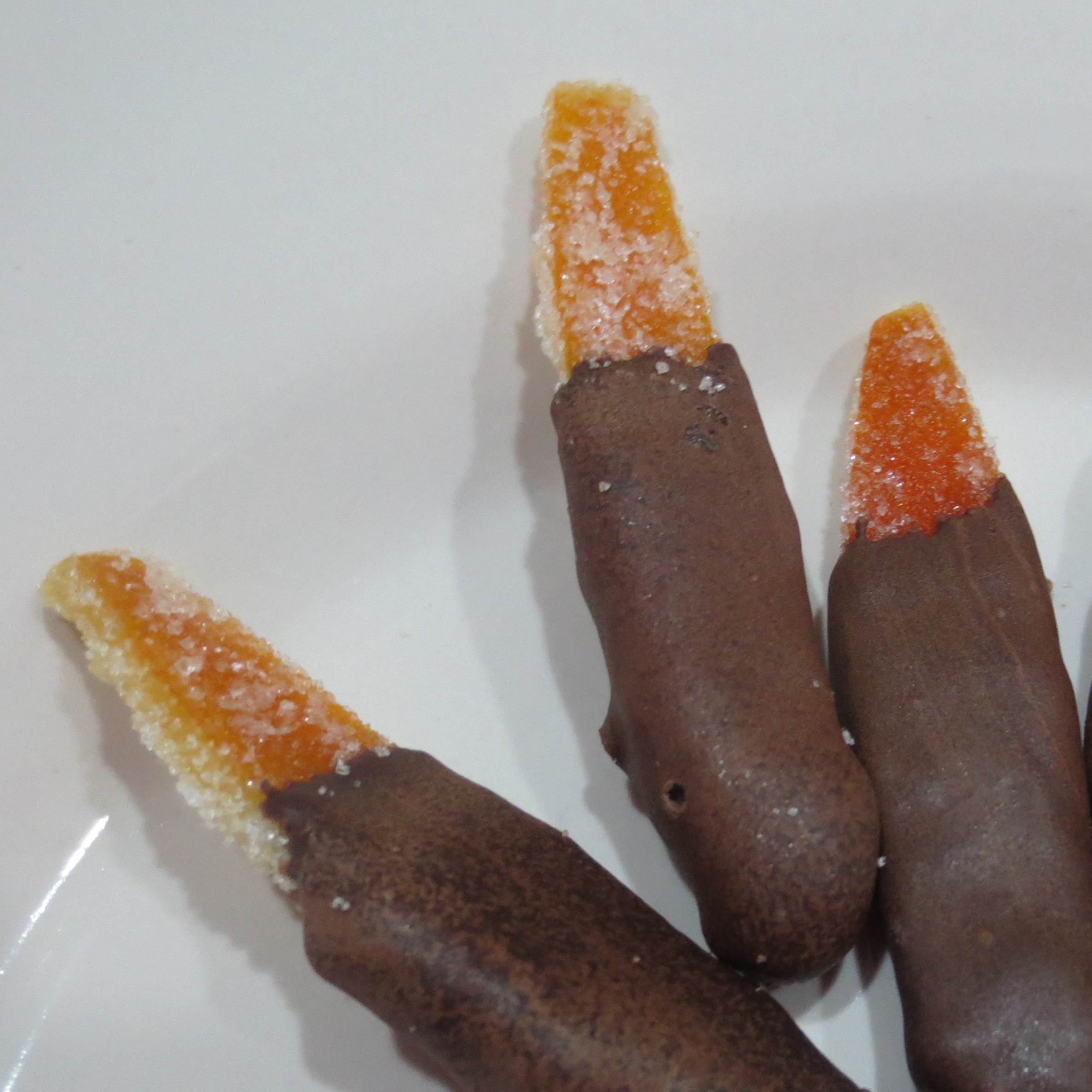 Jen’s request was Candied Orange Peel, some dipped in chocolate, some not. She wanted them last year, but I couldn’t make them. These fruity little candies are one time that appearance counts. You just can’t make them with ugly oranges!