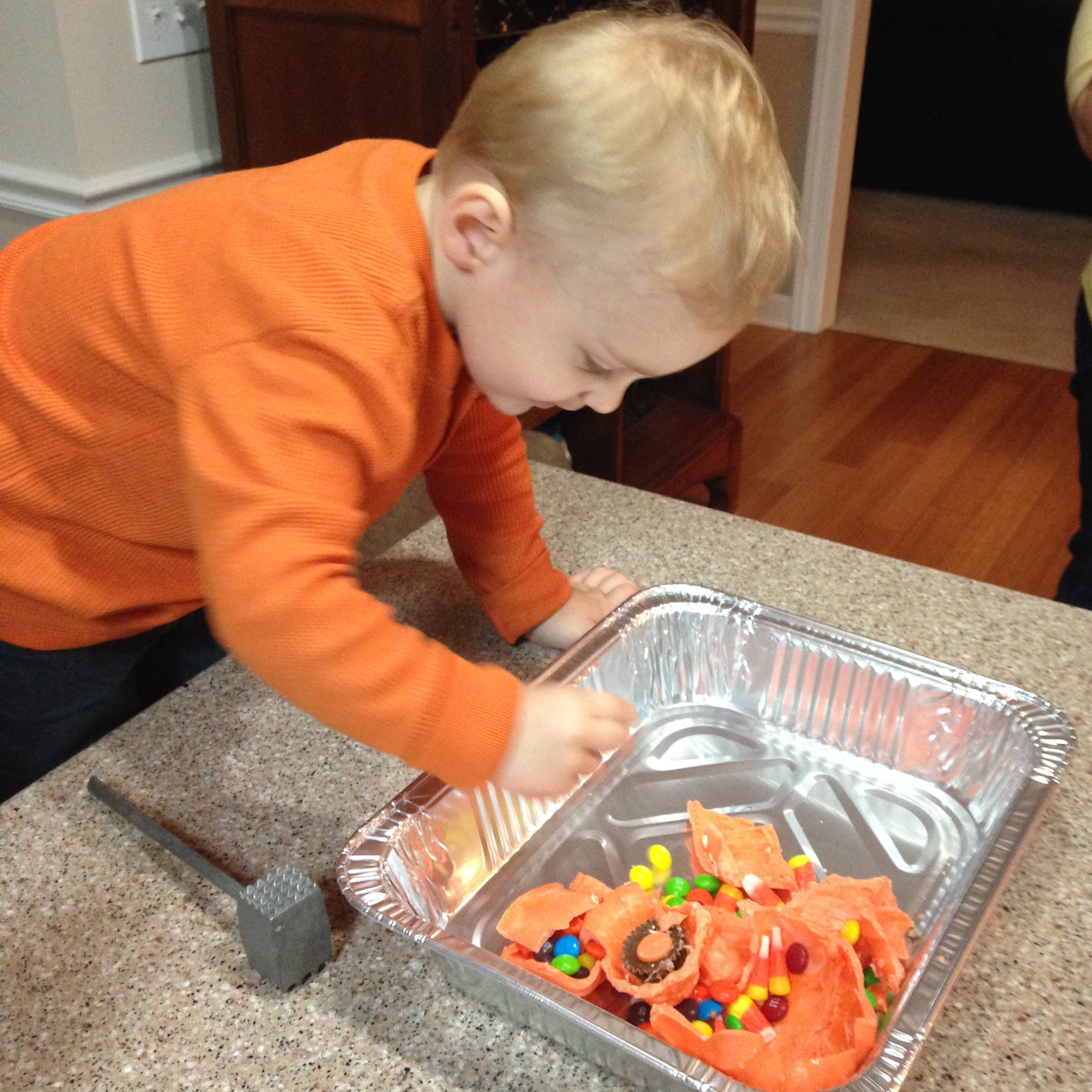 Ever since our children were small we would have chili for dinner on Halloween. Chili is fast and filling and would buffer their stomachs against all the trick-or-treat candy. It was a good plan. Now that our children are grown we celebrate Halloween with a chili supper, but it’s not always that very night. Our grandchildren have their own plans. In fact, this year Kaij and Kelton couldn’t find time at all. Xander didn’t mind though. He had the pumpkin pinata all to himself. Thus, the BANG!