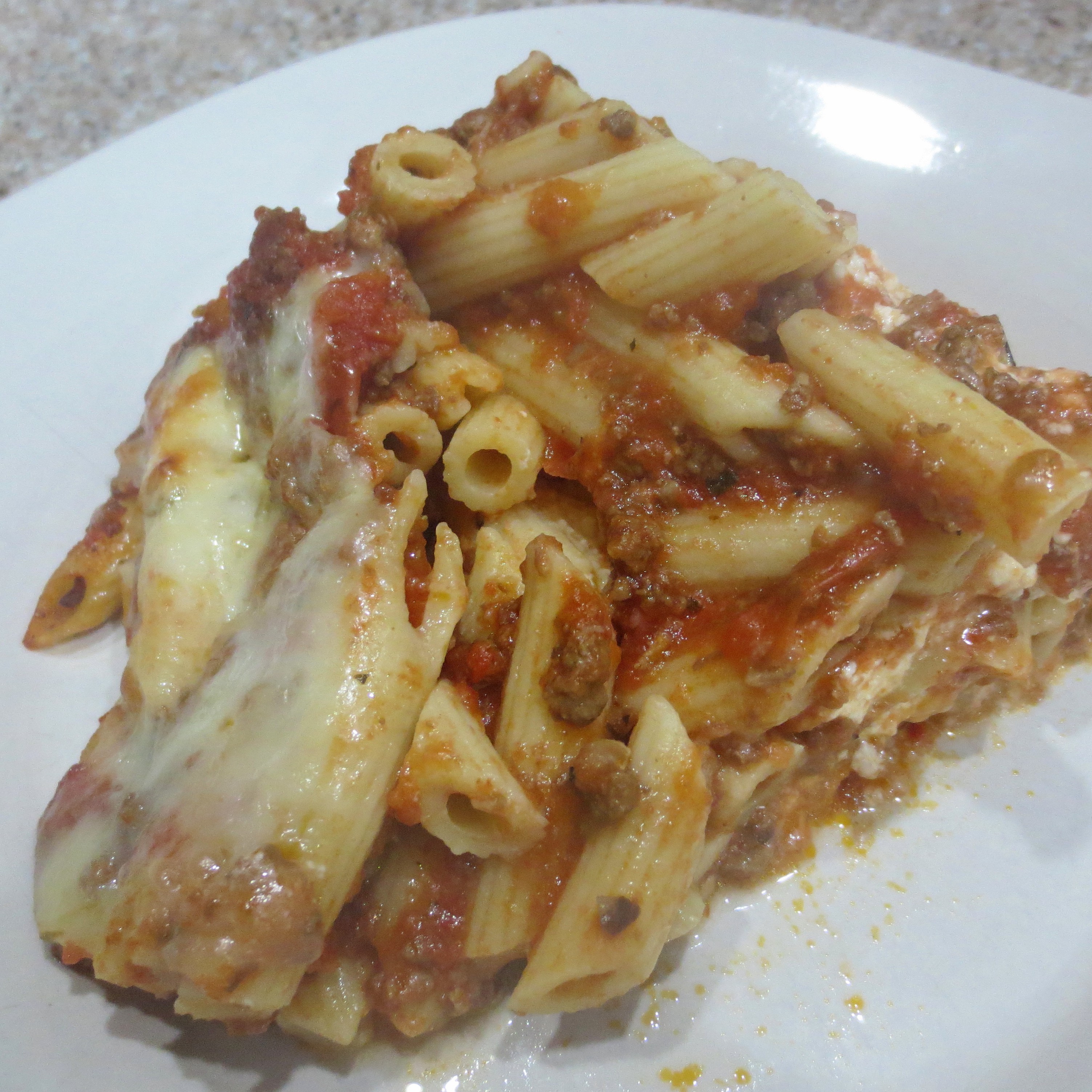 Through all the craziness of the week, a big pan of My Baked Penne Pasta served us well for a couple of nights. I keep a stash of Meat Sauce in my freezer, so it took no time at all to throw this one together. Not much more time would be needed to brown up a pound of ground beef or sausage to add to a jar of sauce, or you could leave the meat out all together for a vegetarian version. The cheese filling provides plenty of protein.