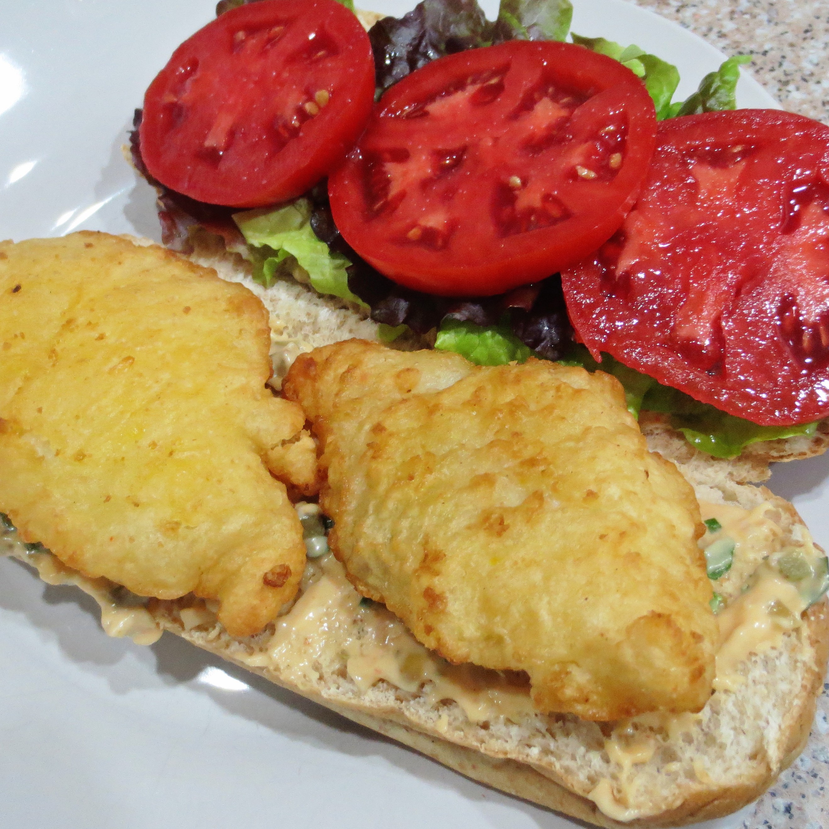 The next night’s dinner was not such a success. I’m always trying (mostly unsuccessfully) to persuade Michael to eat more fish. Ok, I’ll try once more. He prefers his fish fried, likes Po’Boy sandwiches, and a good spread of Coastal Remoulade ought to mask any of that “fishy taste” that turns him off. Wrong, wrong, and wrong! The fish was baked, not fried. There was too much bread. And worst of all, the cod tasted like FISH! At least he liked the tomatoes, but they slipped off onto his plate to be eaten with a fork. Well, I tried. Christmas Eve I went back to the familiar, Shrimp and Grits .