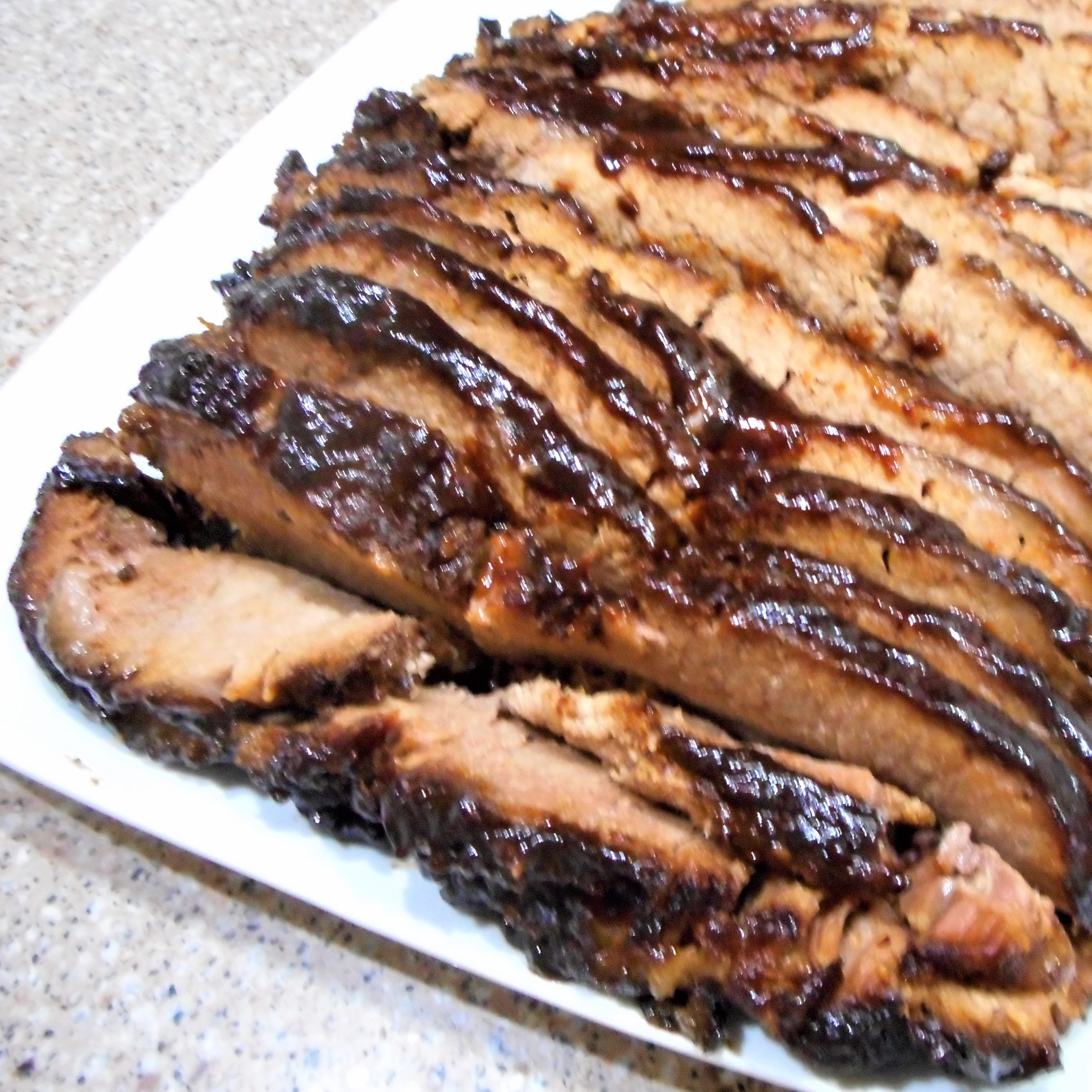 9. If desired, use a fat separator to remove the grease from the BBQ sauce in the cooker. Pour about half of the sauce over the resting brisket and serve the rest on the side.