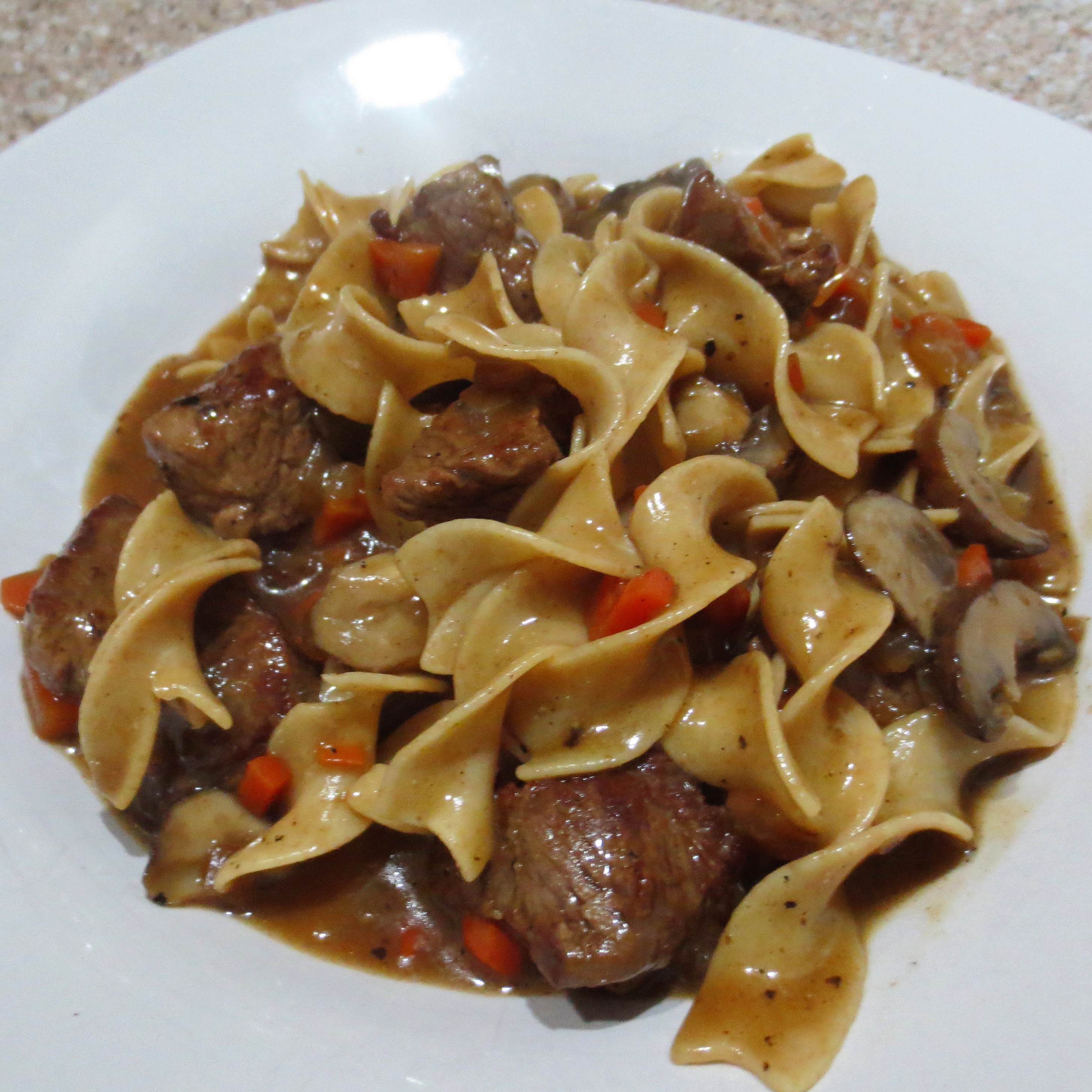 Beef Stroganoff is typically served over wide egg noodles, garnished with fresh parsley. The steak may be either cut into small cubes or strips. I think the cubes stay more tender, particularly if they are quickly seared over high heat and then set aside while the sauce is prepared.