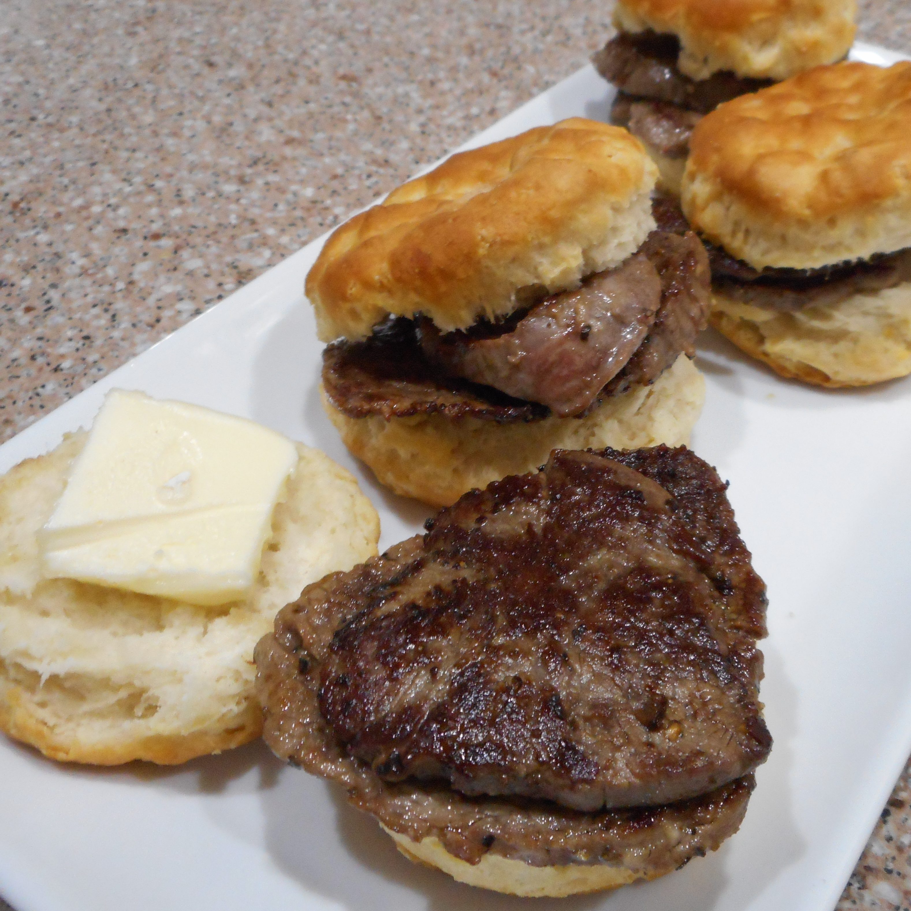 You may certainly use your own biscuit recipe or frozen biscuits instead of making these biscuits from scratch, but make sure you butter the biscuits with a huge pat of real salted butter before adding the hot steak. That is what makes the “gravy” sauce.