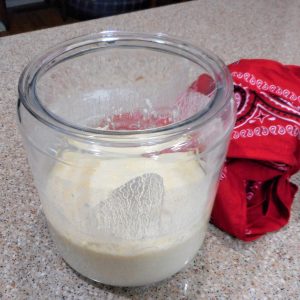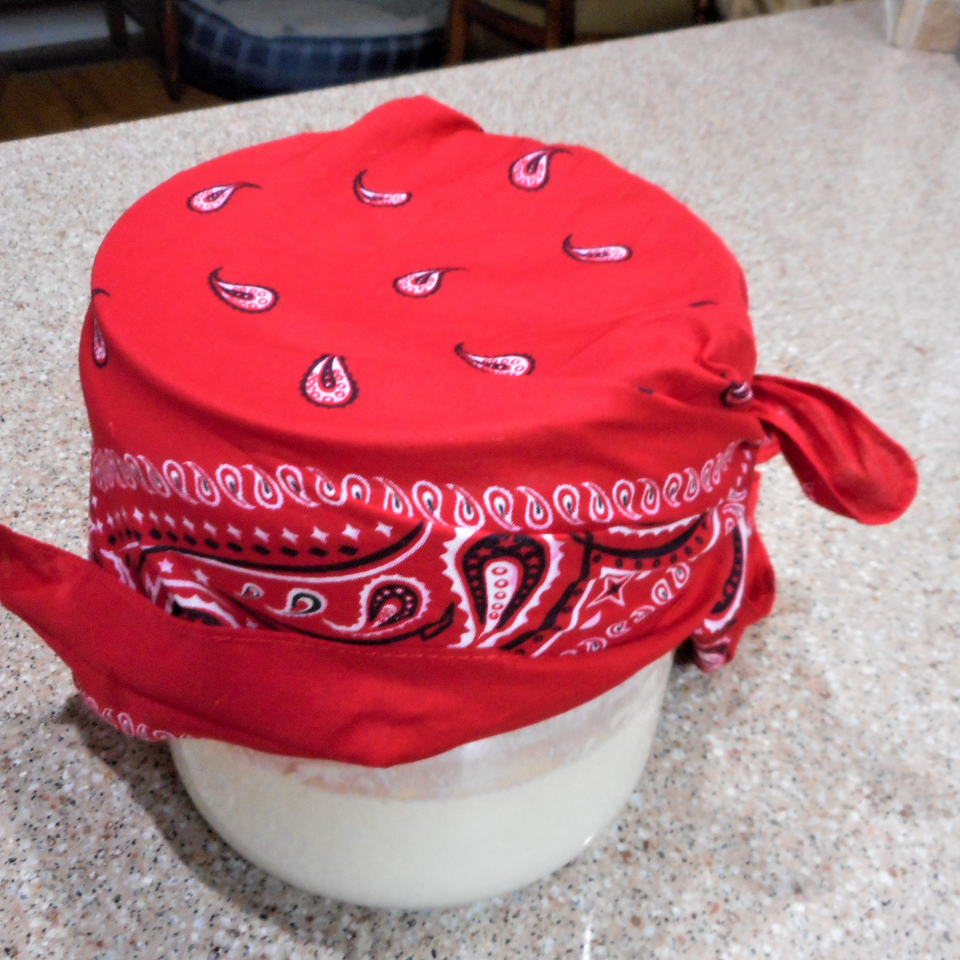 2. Cover the crock with a thin dish towel or bandanna and leave on the counter top. The starter needs to sit at 70° or warmer.