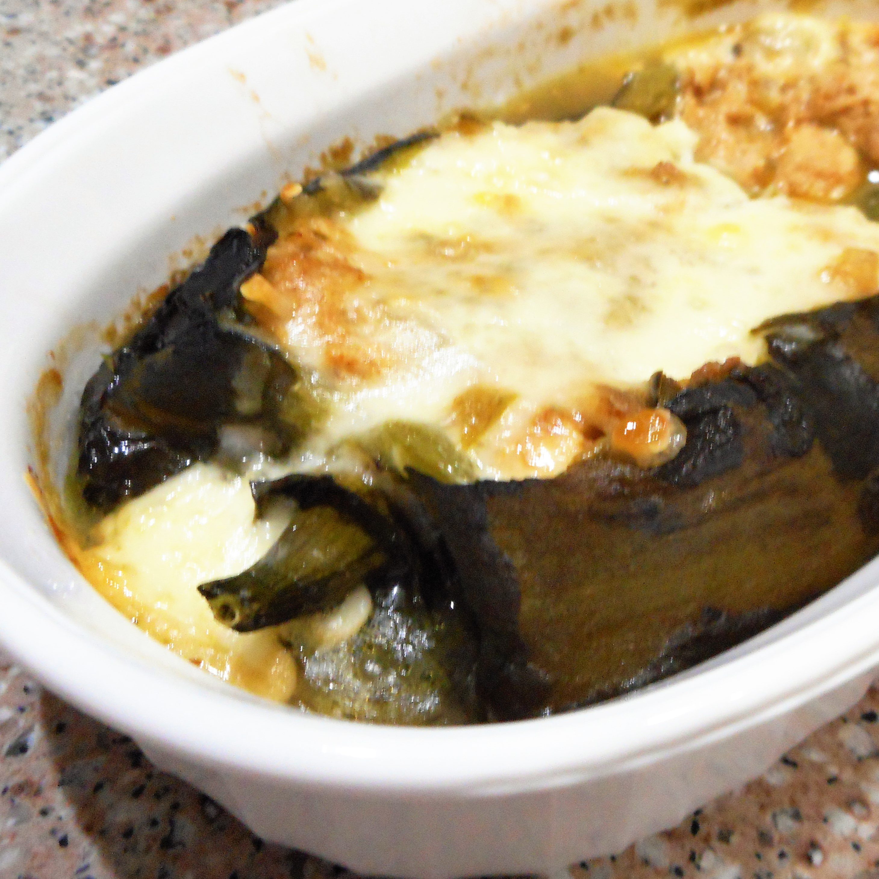 1. Roast the poblano peppers on a grill or under the broiler, turning frequently, until nicely charred on all sides. Place the hot peppers in a plastic bag and seal. When cool enough to handle peel the skin off the peppers and cut a slit to remove the seeds, leaving the stem and tip whole.