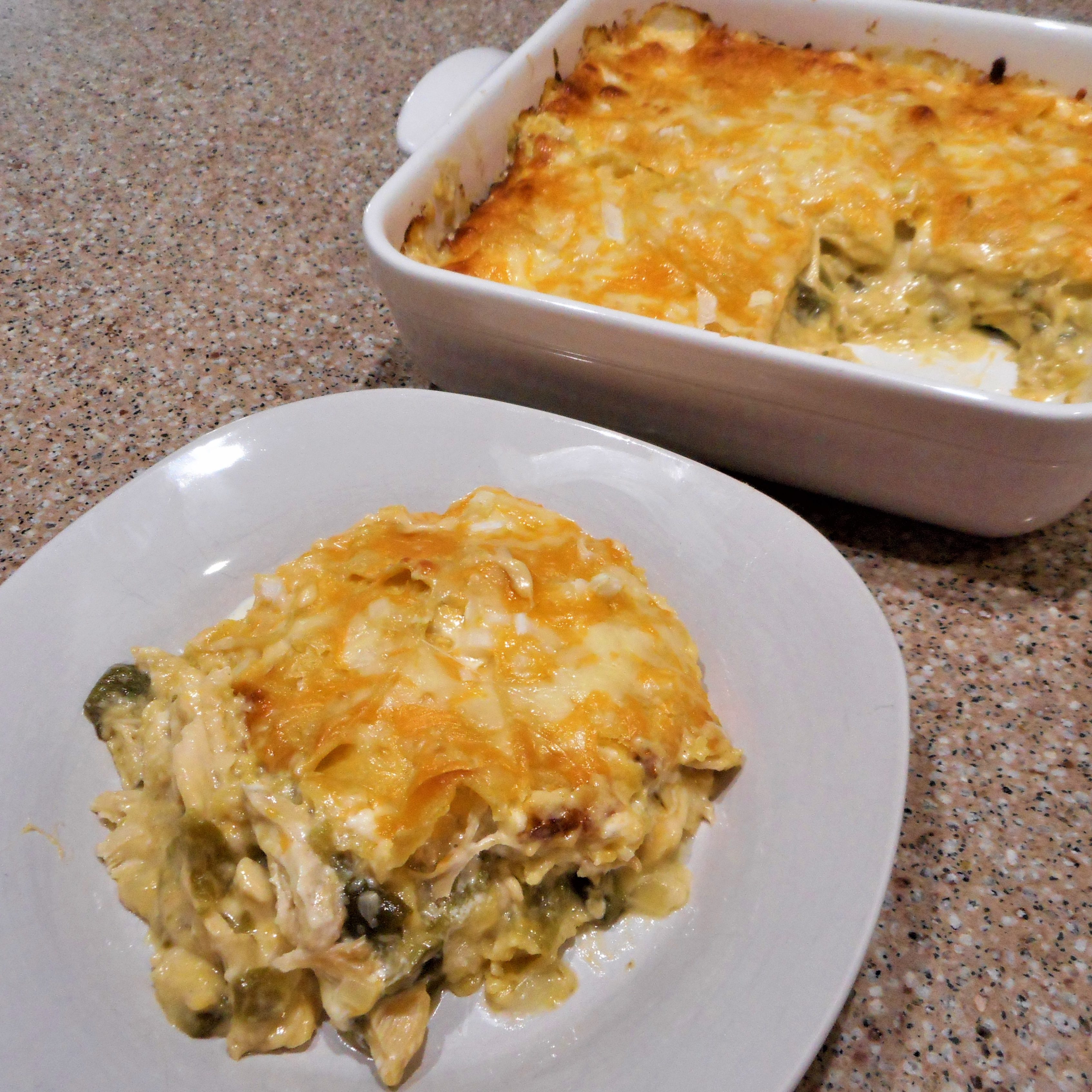 Layering the tortillas rather than rolling the enchiladas make assembling this casserole a cinch. If you have the time, substituting roasted and chopped poblano peppers for the canned chiles adds another depth of flavor.