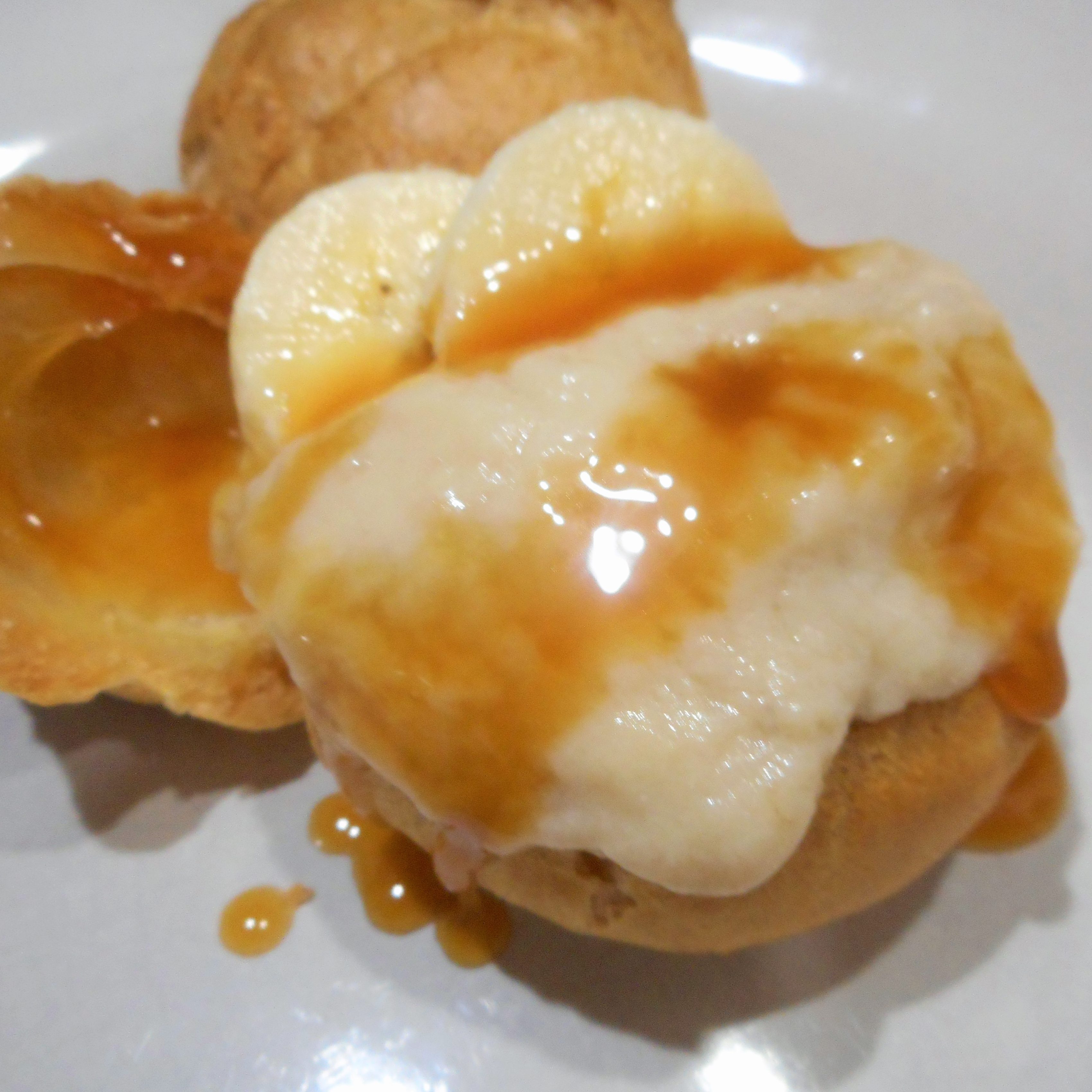 4. Fill each puff with the pudding and top with sliced banana, then drizzle the butterscotch sauce over all.