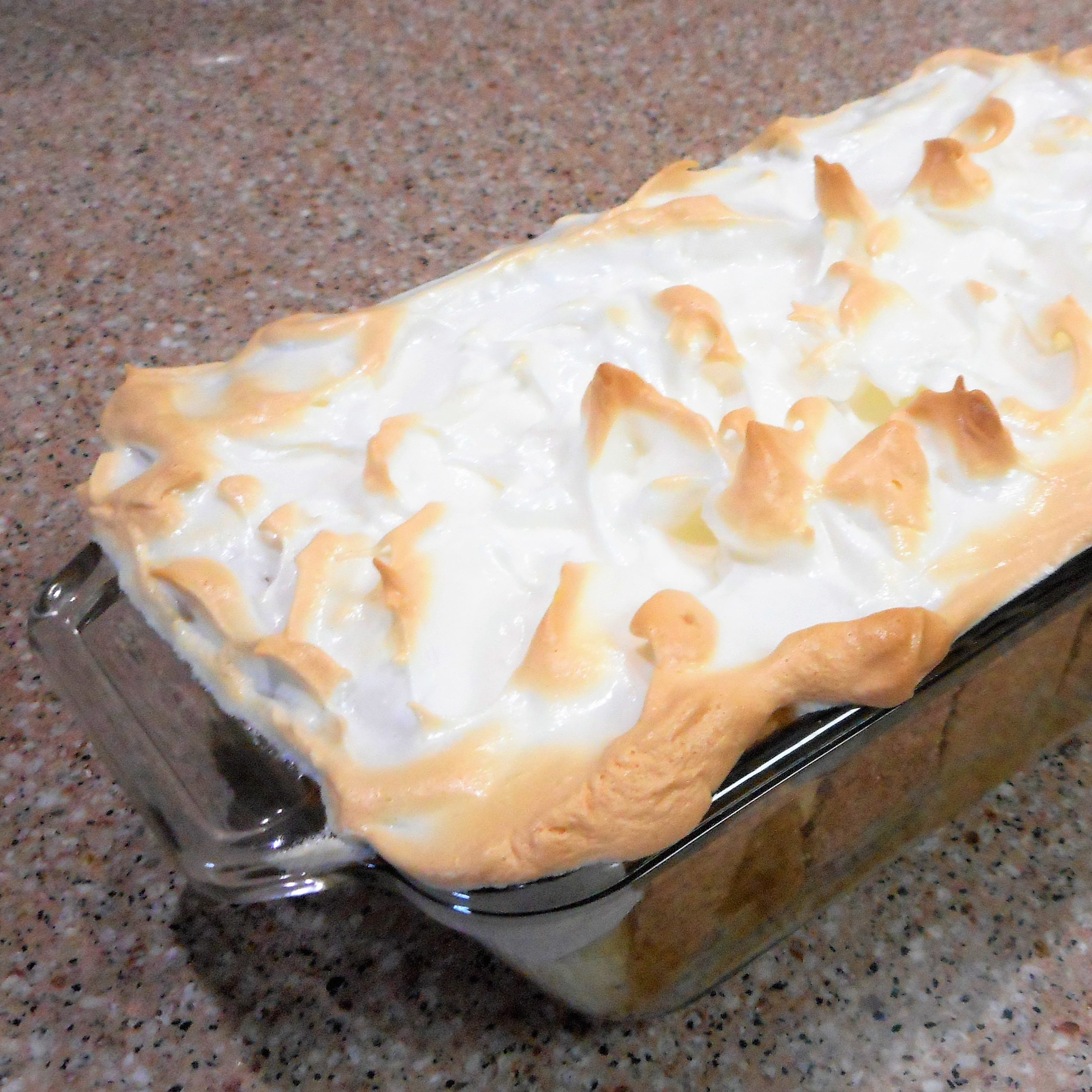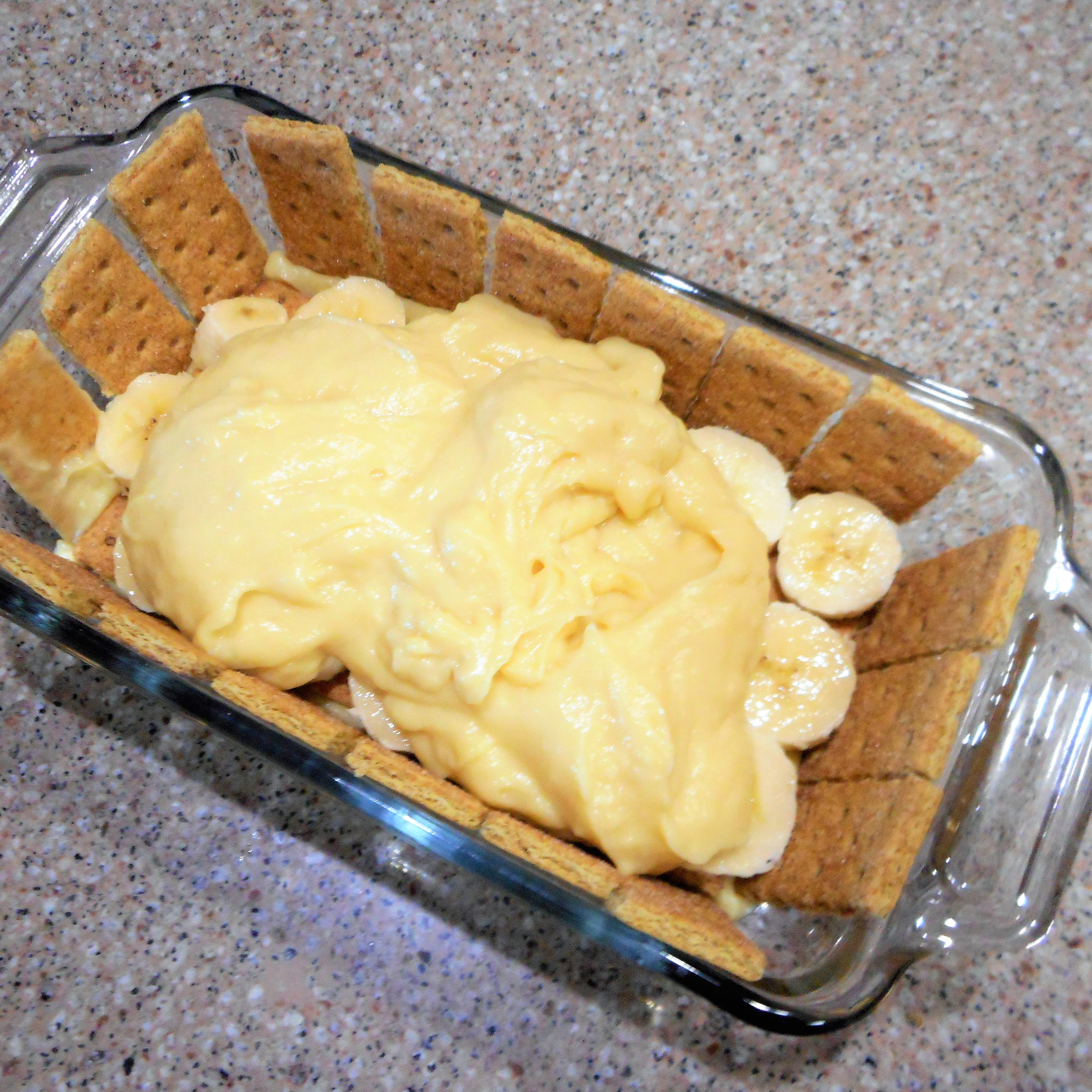 3. In a glass loaf pan, arrange some of the graham crackers in a single layer and top with a layer of bananas that have been sliced about 1/4 inch thick. Top the banana layer with 1/2 of the pudding. Repeat the layers of graham crackers and bananas but this time add graham cracker the have been broken into individual crackers laying on edge around the sides of the baking dish before spreading the remaining pudding. This side layer provides a crust for the meringue to cling to,