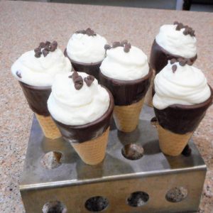 2. In a very narrow microwave safe bowl or small glass measuring cup, microwave the bittersweet chocolate according to the package directions until smooth. Invert each sugar cone and dip the opening into the chocolate, then allow the excess chocolate to drip back in before propping up each cone in a small glass to dry.
