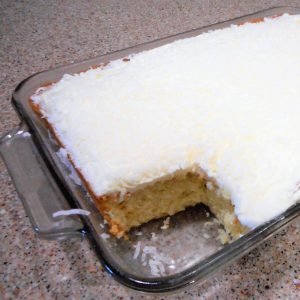 8. Spread frosting over cooled cake and sprinkle with remaining coconut. Refrigerate for 2 hours before cutting. Store in the refrigerator.