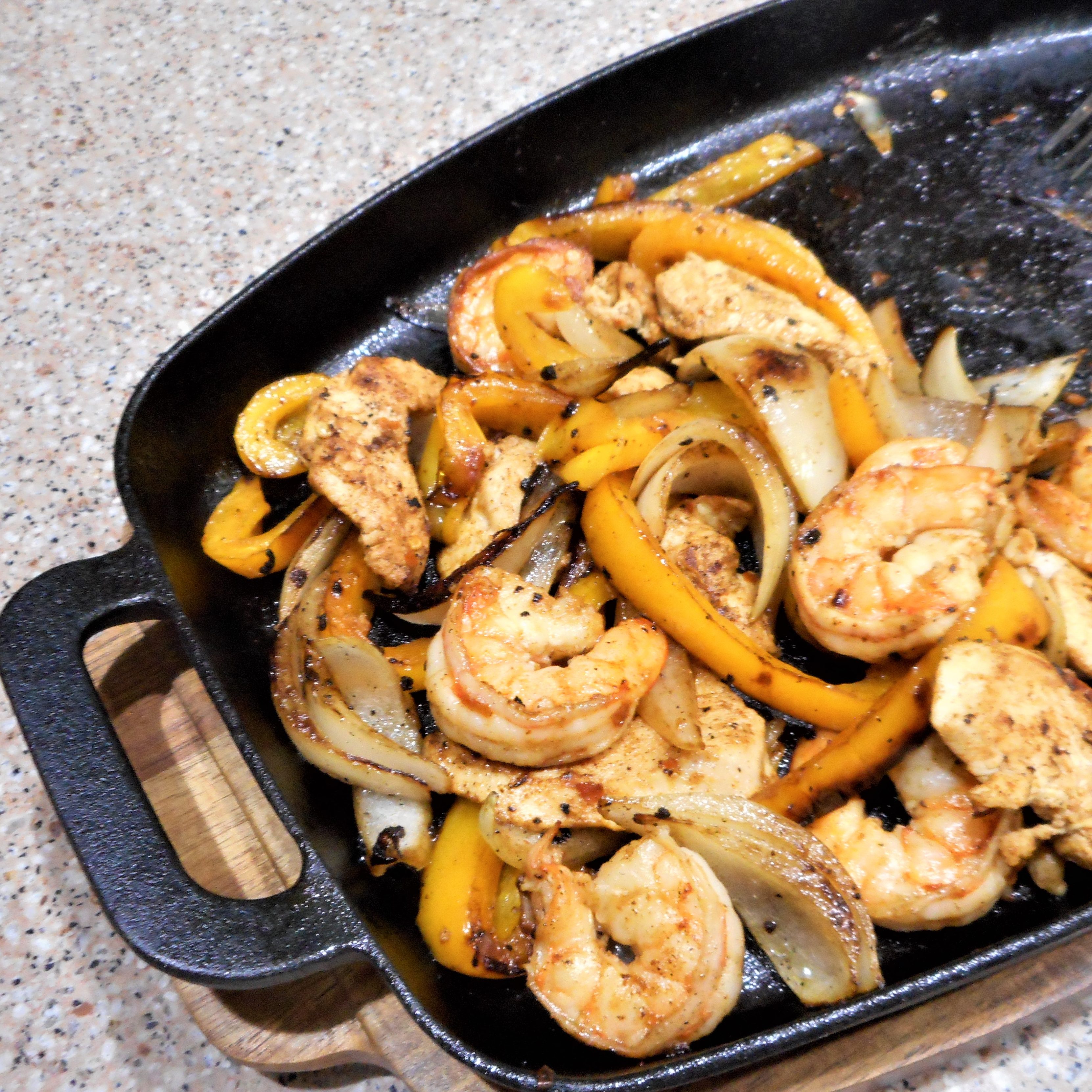 2. Heat a large cast iron skillet over high heat. Add a tablespoon of olive oil. Add the shrimp mixture, marinade included, and sauté until fully cooked. Using a pair of tongs, remove the shrimp from the skillet and repeat with the chicken. Add the vegetables. Sauté until tender and charred. Add the shrimp and chicken back into the cast iron skillet and toss to combine.