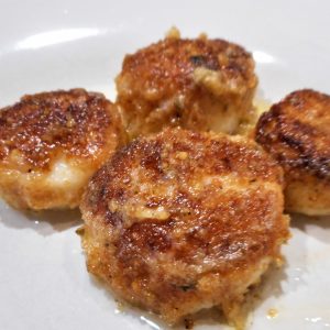 Scallops coated with Cajun seasoning and fried in butter to a golden brown.