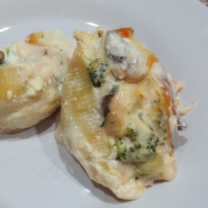 6. Combine the broccoli mixture with the cheese mixture and divide among the pasta shells and arrange in the baking dish. Pour the remaining sauce evenly over the top.