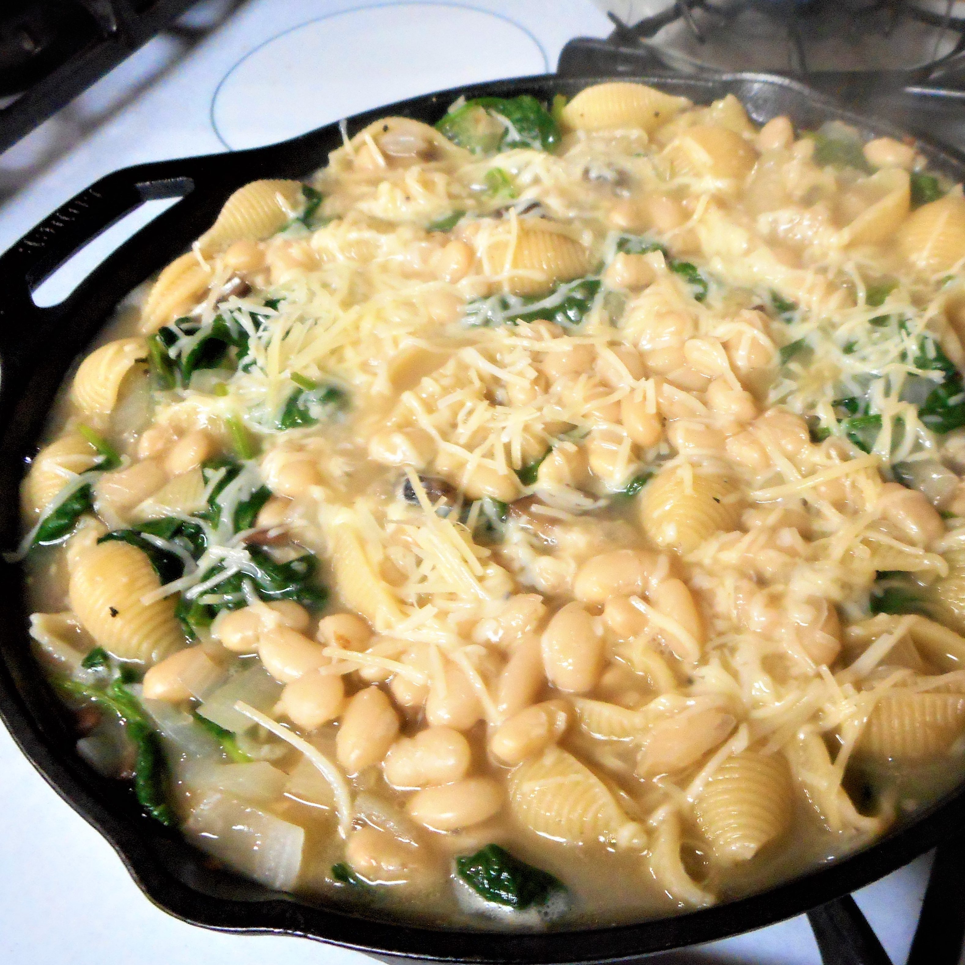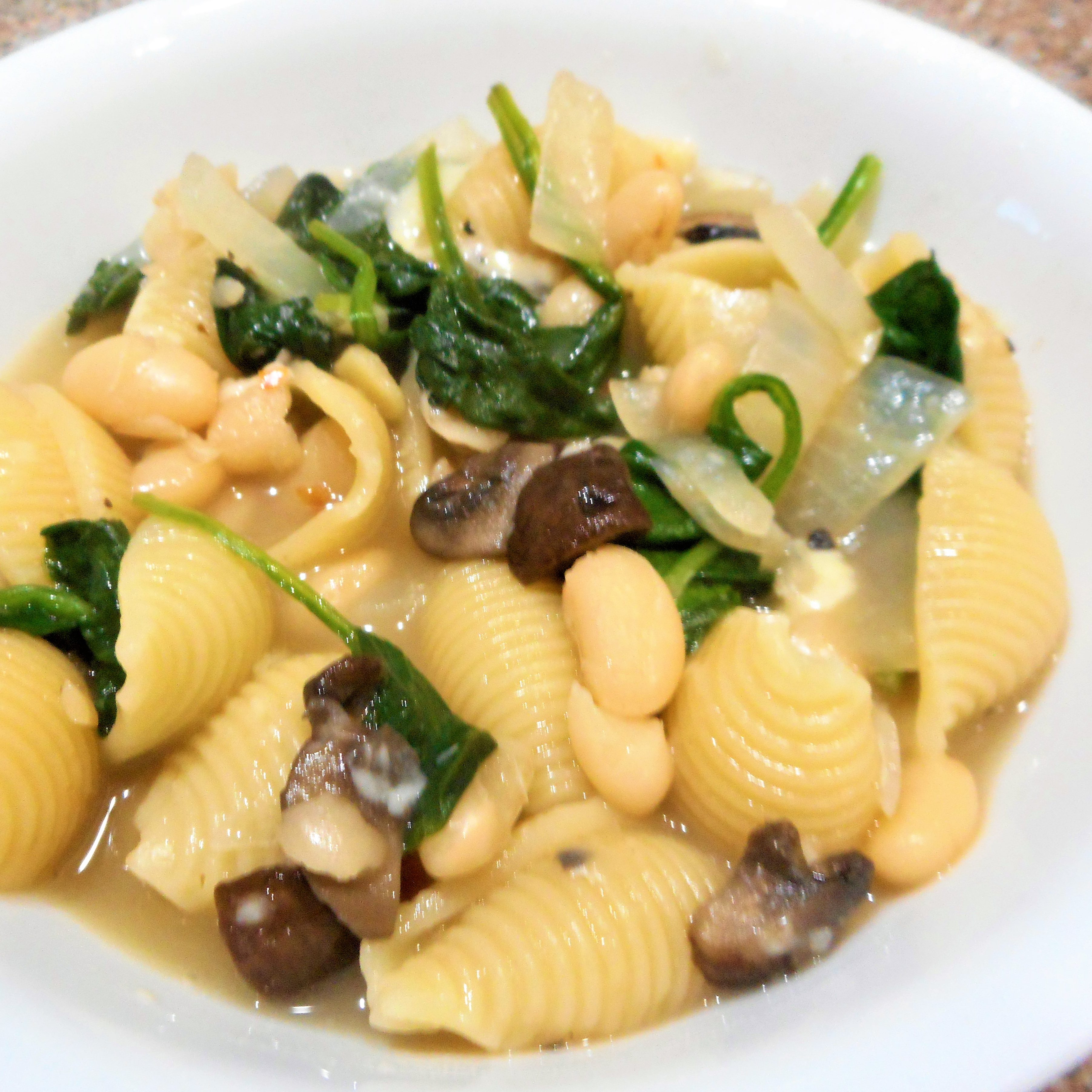 2. Saute onion and mushrooms in hot oil in a large skillet over medium heat 5 minutes. Add kale and next 4 ingredients; cook, stirring often, 15 minutes or until kale is tender. If you have chosen to use spinach, you will only need to simmer the skillet briefly at this point. Add beans, and cook 1 minute.