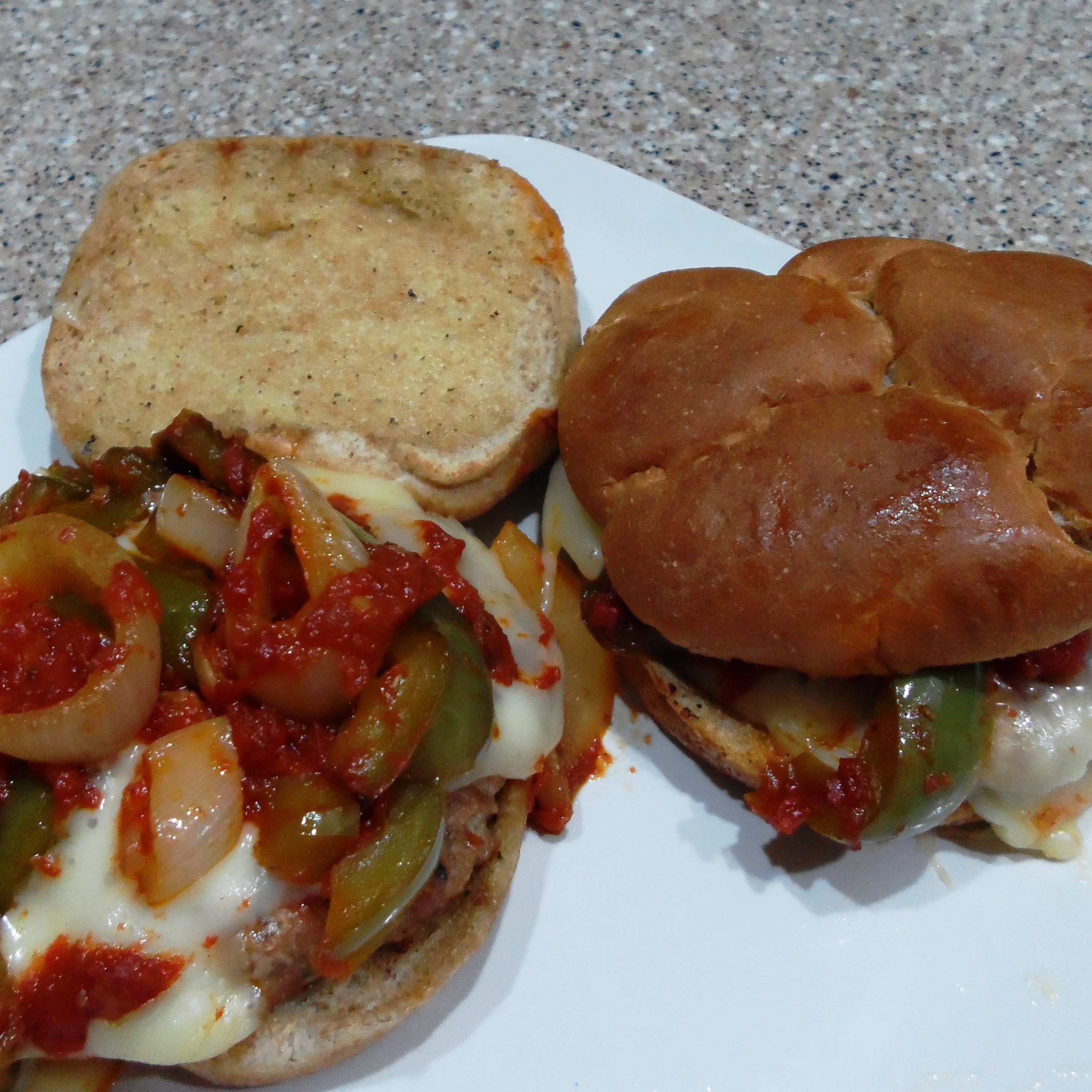 5. Divide the pepper and onion sauce evenly among the burgers and add the top of the bun.