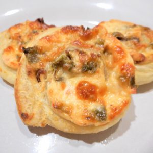 6. Roll the pastry into a log and cut into 1/2″ pieces. Place the pinwheels on the prepared baking sheet, leaving a little room between each. Bake for 18-22 minutes, or until the pastry is beginning to brown. Cool slightly before removing to a serving platter.