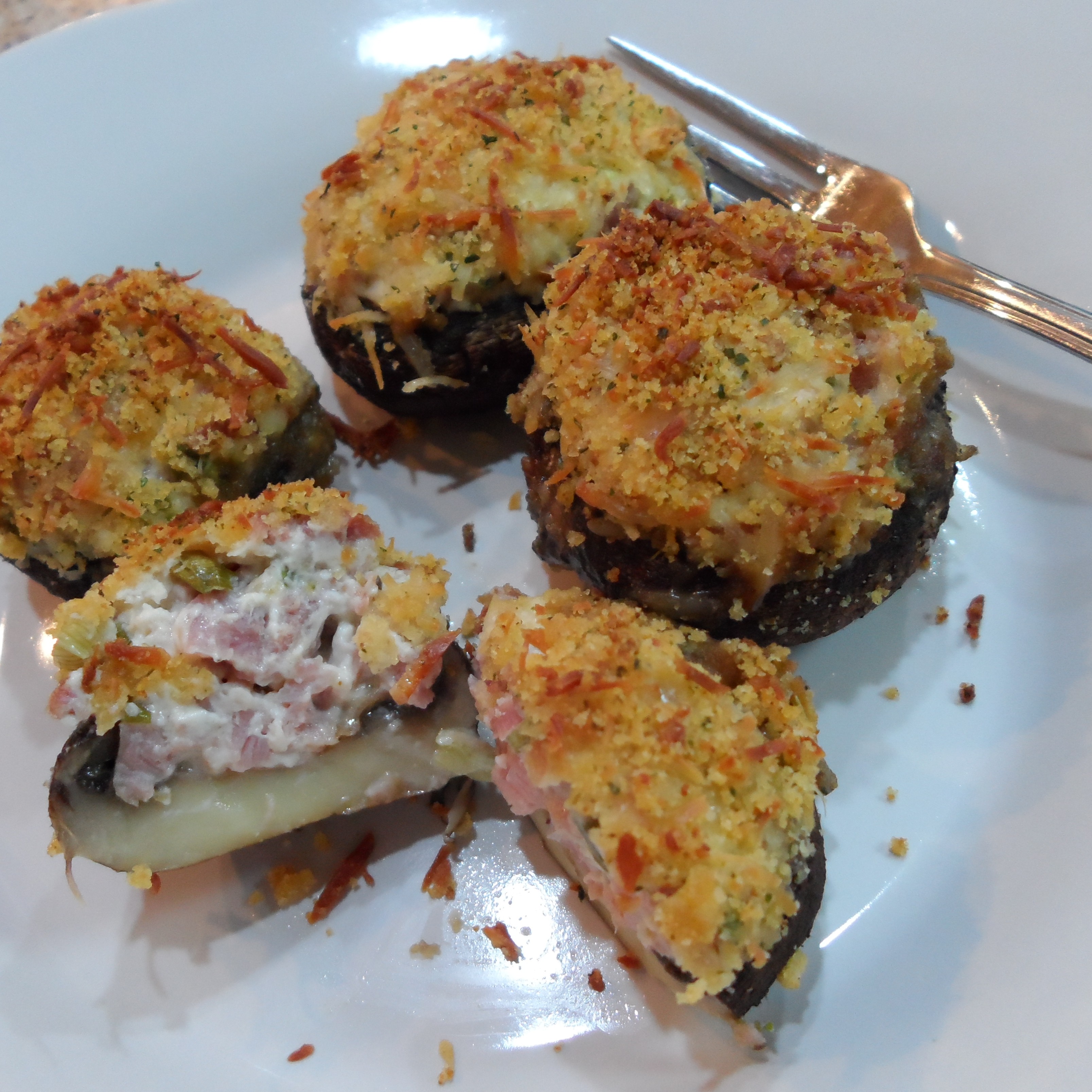3. In a medium bowl, combine the cream cheese, 1/4 cup Parmesan, and black pepper. With a dinner fork, mix very well until creamy. Stir in the green onion and then the diced ham until evenly combined. Divide the ham mixture among the mushroom caps.