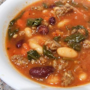 When I think of winter food, comforting soups come to mind. I probably won’t have the soup pot simmering again until next fall, but these soups are both luscious recipes worth saving. Let me share them with you. The first is Italian Sausage, Bean, and Kale Soup. I first made this on one of those damp and gloomy days when nothing but a bowl of slightly spicy warmth would do. A brothy concoction of good-for-you beans and kale is brightened up with the addition of crumbled Italian sausage.
