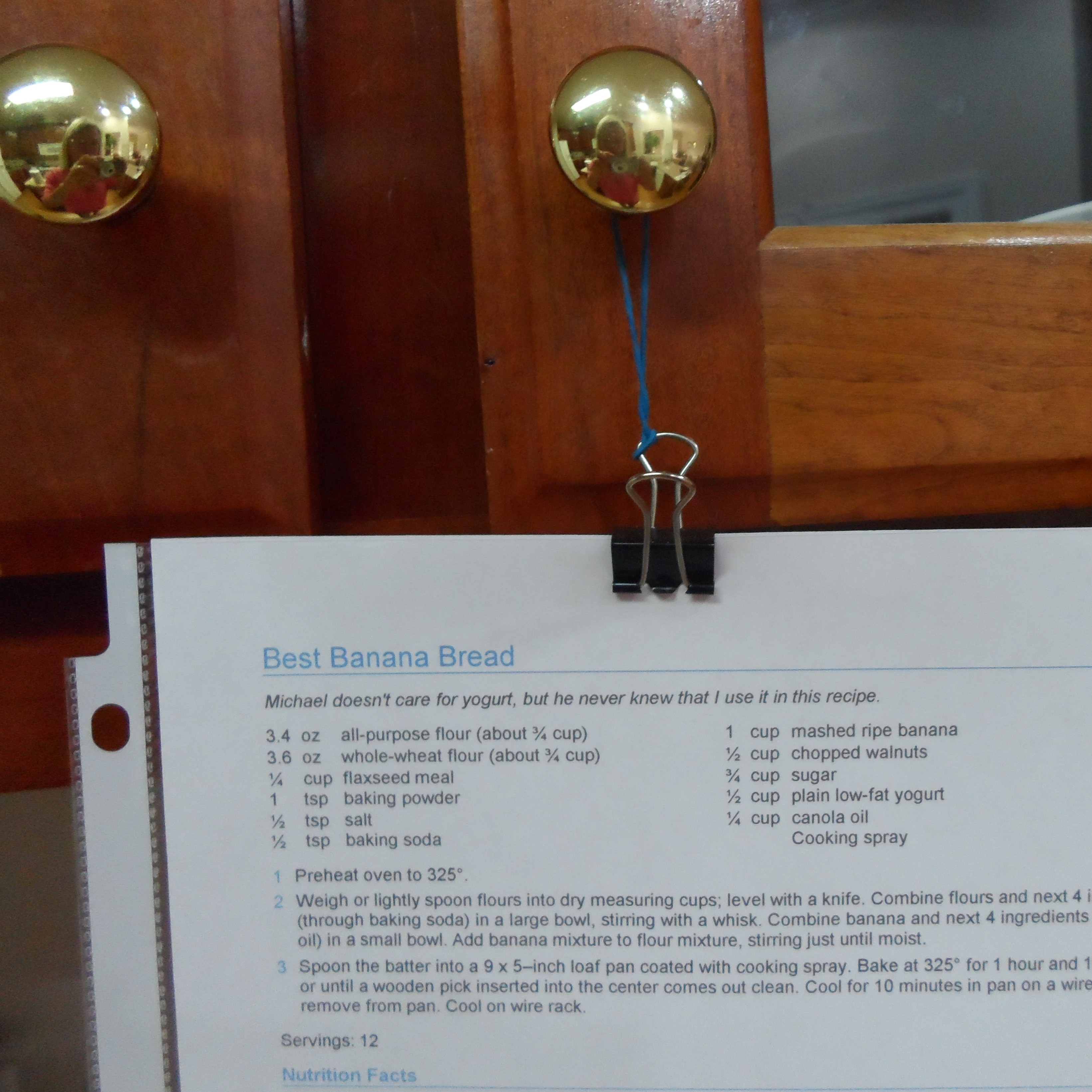 If you keep the recipes in your notebook you probably have them in plastic sheet protectors. Just loop a rubber band through a binder clip and hang the recipe on a cabinet knob. Your recipe stays clean and is hanging at eye level. Your cost is next to nothing.