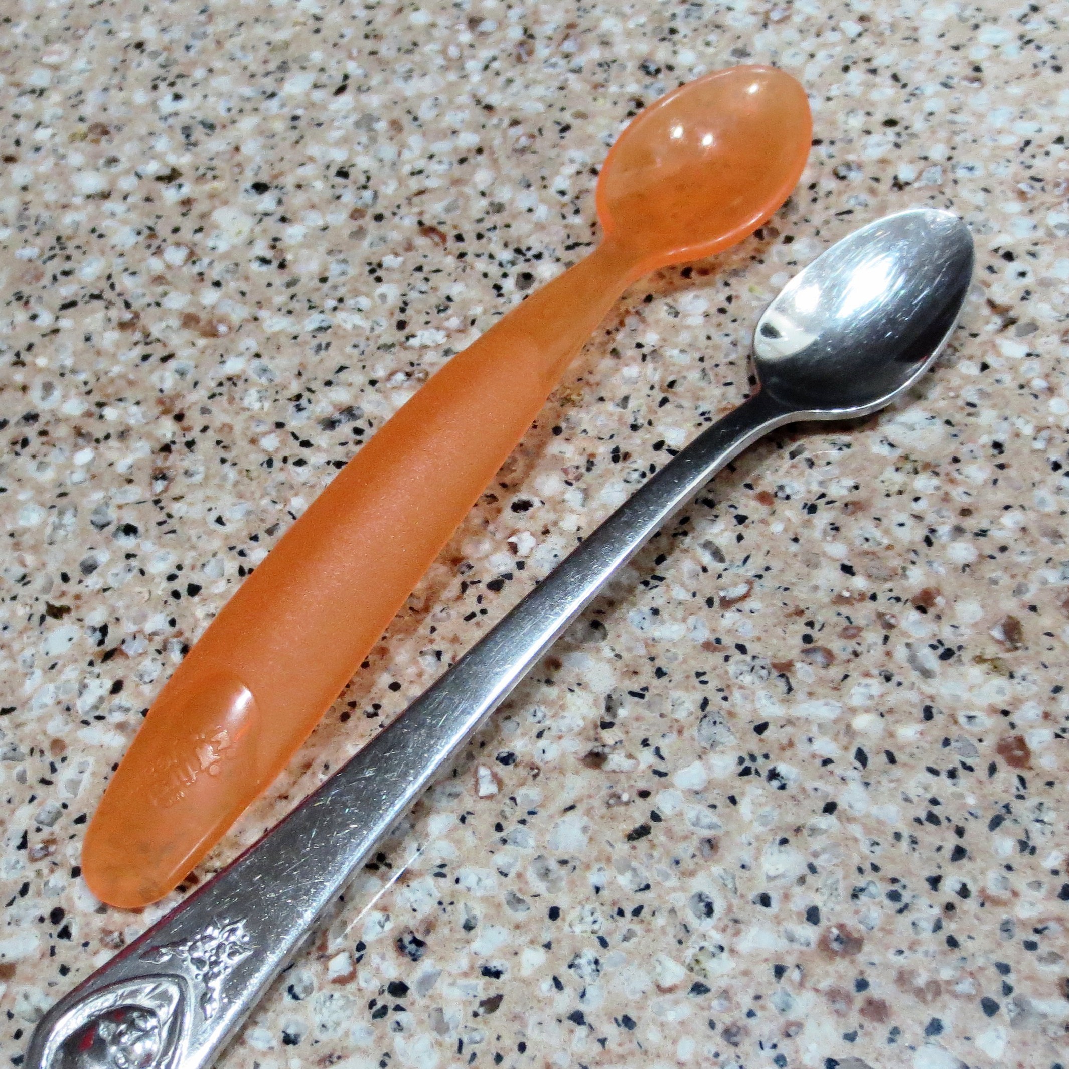 Hold on to those old baby spoons! They make excellent kitchen tools. The metal one is 40 years old, from my first child, and the orange plastic one is 12 years old, from my first grand child.