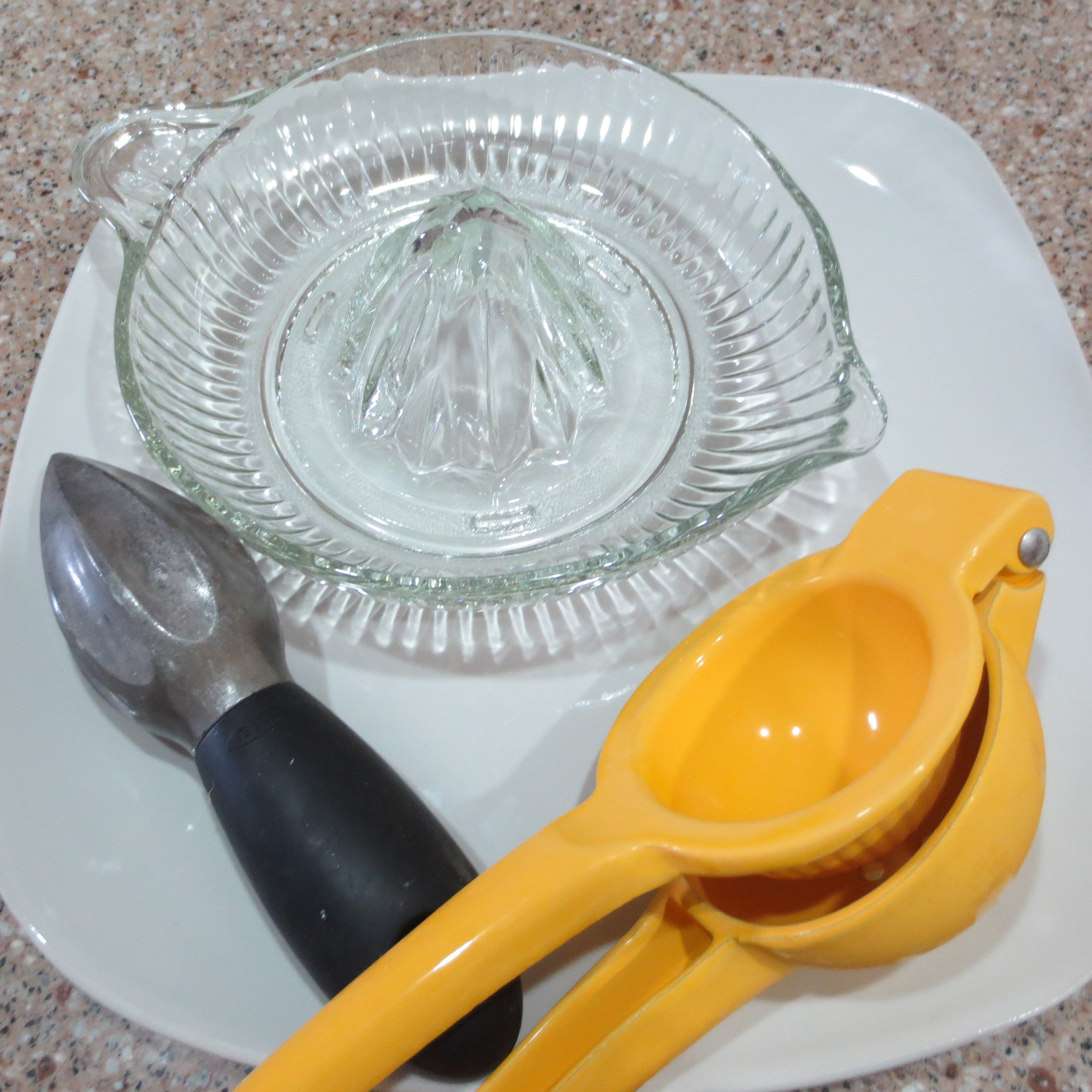 The yellow juicer shown above is also called a juice press, and it does just what the name implies. By lever action a juice press extracts the juice, leaving the seeds and rind behind. I press the juice into a measuring cup to track the amount. Juice pressed are relatively new, but easy to find starting at about $8.00.
